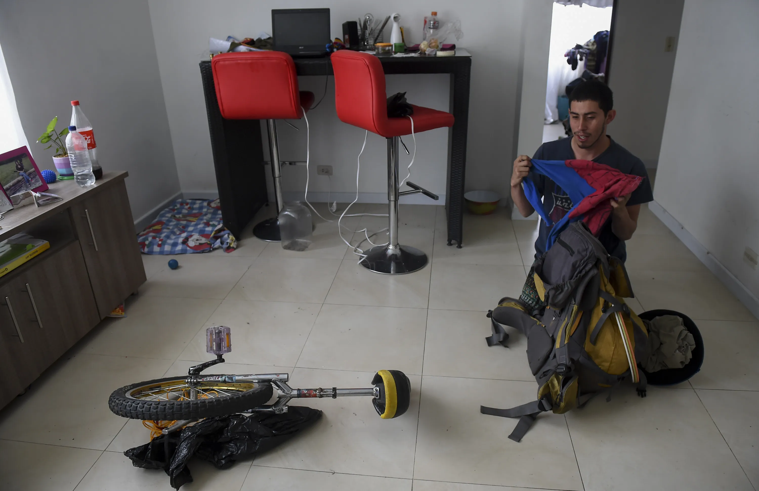 Colombian Jahn Fredy Duque gets ready to dress up as superhero “Spiderman” to perform on the streets in Bogota, Colombia on April 24, 2017. Duque hangs a white cloth 26 meters long – his cobweb – from a bridge near the international center of Bogota, where he performs in the street for a livelihood. (Photo by Raul Arboleda/AFP Photo)