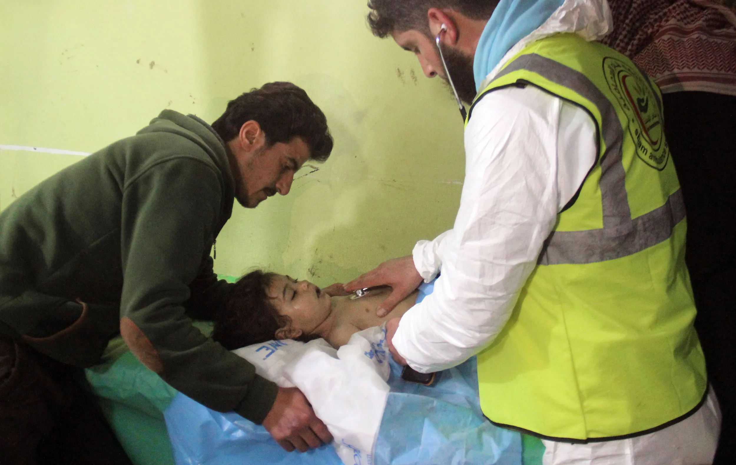 An unconscious Syrian child receives treatment at a hospital in Khan Sheikhun, a rebel-held town in the northwestern Syrian Idlib province, following a suspected toxic gas attack on April 4, 2017. A suspected chemical attack killed at least 58 civilians including several children in rebel-held northwestern Syria, a monitor said, with the opposition accusing the government and demanding a UN investigation. (Photo by Omar Haj Kadour/AFP Photo)