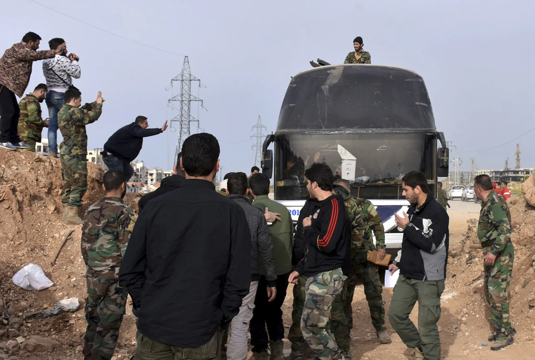 In this photo released by the Syrian official news agency SANA, Syrian government forces welcome a bus carry Syrian citizens and pro-government fighters who evacuated from the two pro-government villages of Foua and Kfarya, upon their arrival at a cross point between the rebels and the Syrian government forces on the outskirts of Aleppo city, Syria, Friday, April, 21, 2017. Syrian state TV says the troubled population transfers involving thousands of Syrians have resumed after stalling for days following a massive explosion that killed dozens. (Photo by SANA via AP Photo)