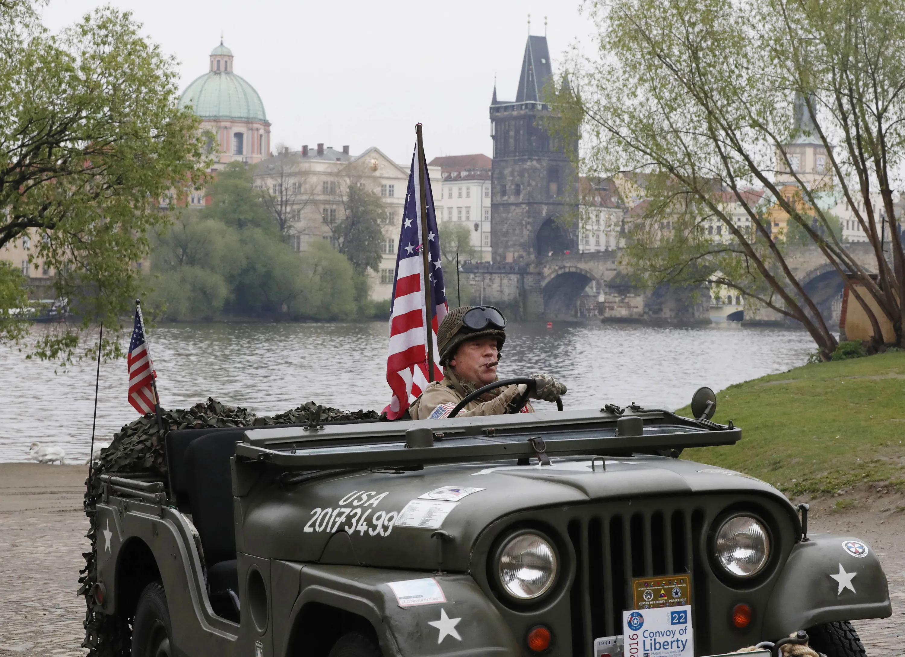 A history enthusiast dressed in U.S. Army World War II uniform drives his military jeep during the “Convoy of Liberty” that commemorates the 72nd anniversary of the end of the WWII in Prague, Czech Republic, Friday, April 28, 2017. (Photo by Petr David Josek/AP Photo)