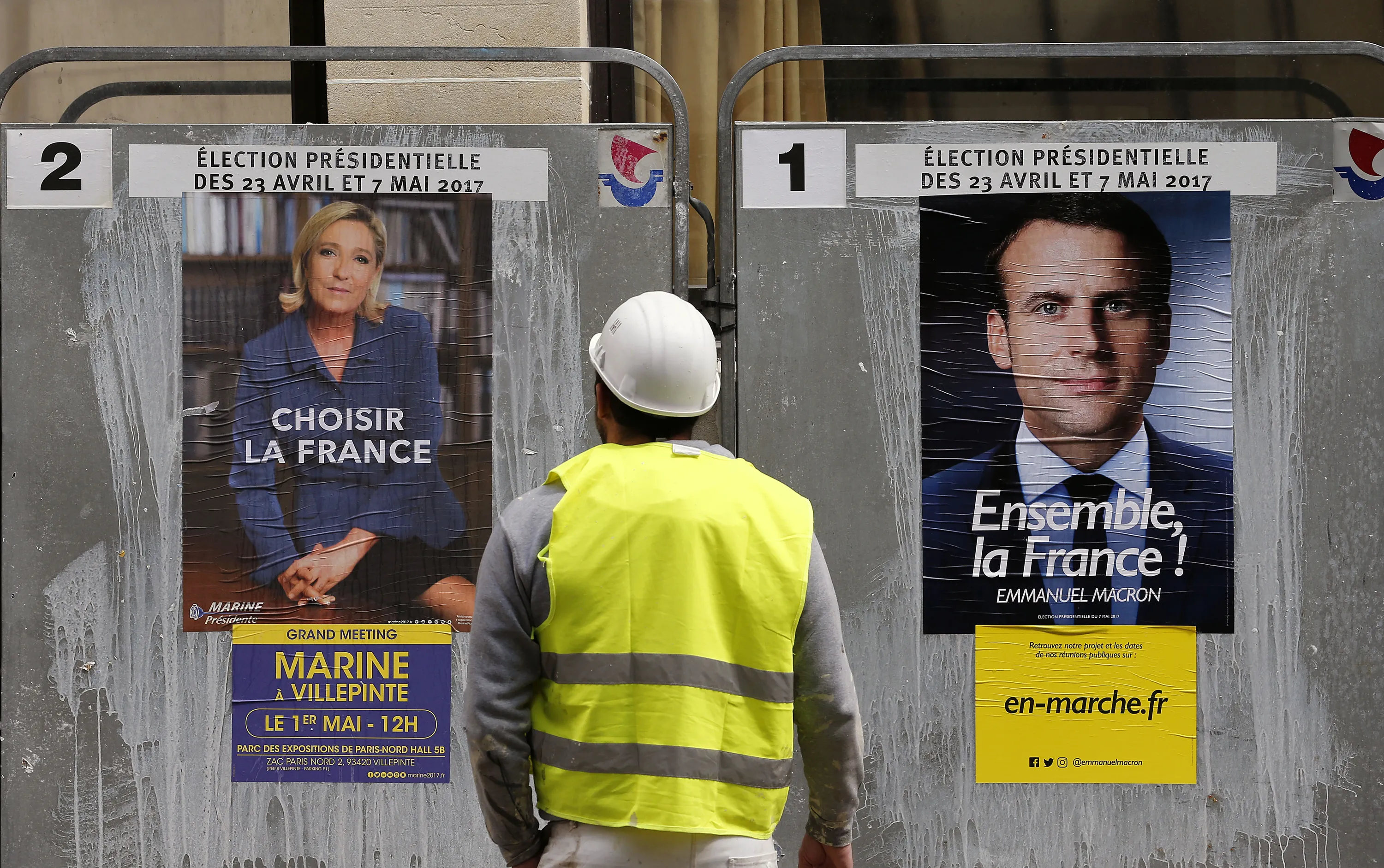 A worker looks at electoral posters of French presidential election candidate for the En Marche ! (Onwards!) movement Emmanuel Macron (R) and French presidential election candidate for the far-right Front National (FN) party Marine Le Pen (L) on April 28, 2017 in Paris, France. Le Pen and Macron arrived in the lead positions in the first round of the presidential elections. France will hold the second round on May 07, 2017. (Photo by Chesnot/Getty Images)