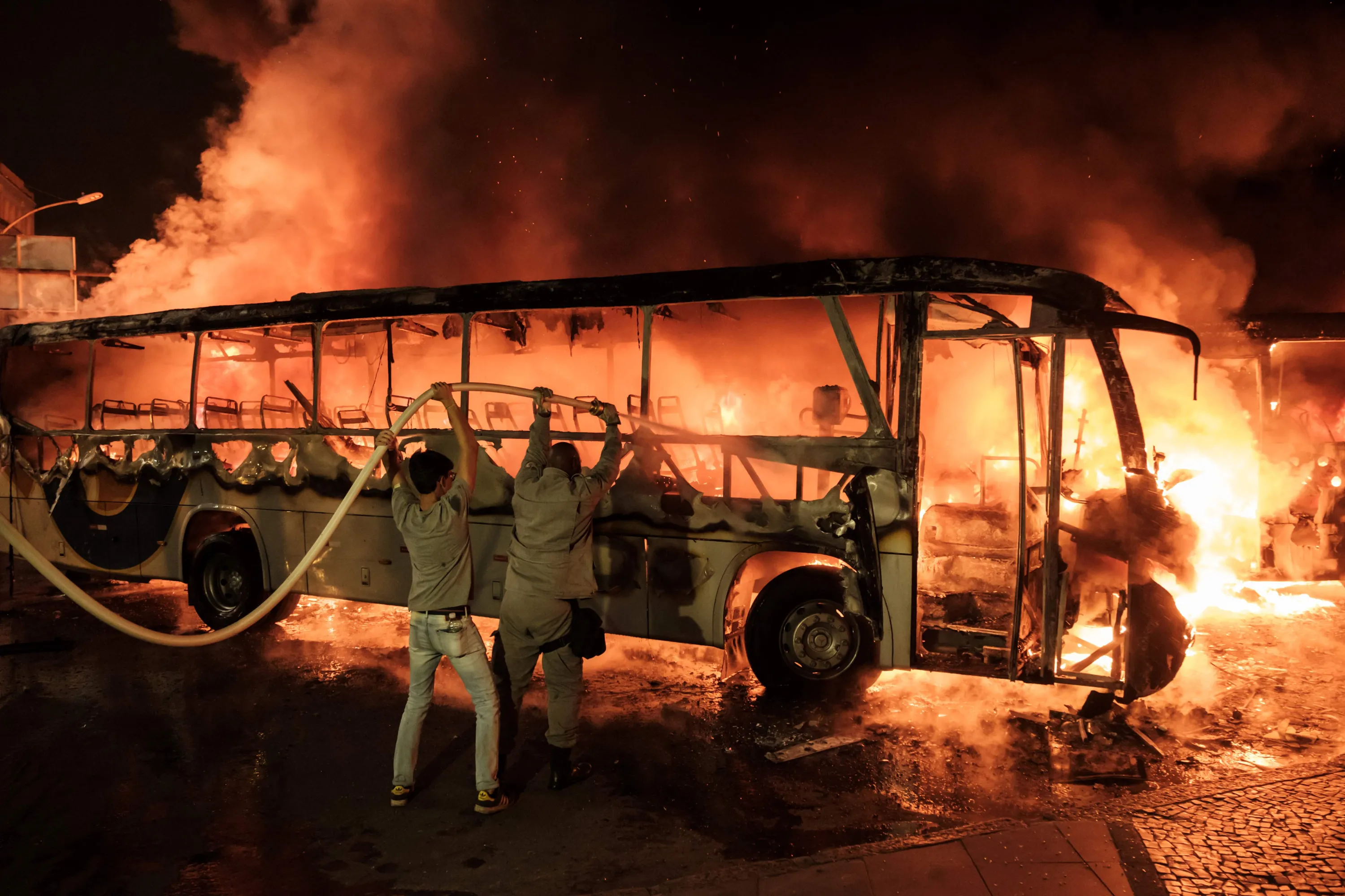 Firefighters try to put out a burning bus set on fire by protesters during the nationwide strike called by unions opposing austerity reforms in Rio de Janeiro, Brazil, on April 28, 2017. Major transportation networks schools and banks were partially shut down across much of Brazil on Friday in what protesters called a general strike against austerity reforms in Latin America' s biggest country. (Photo by Yasuyoshi Chiba/AFP Photo)