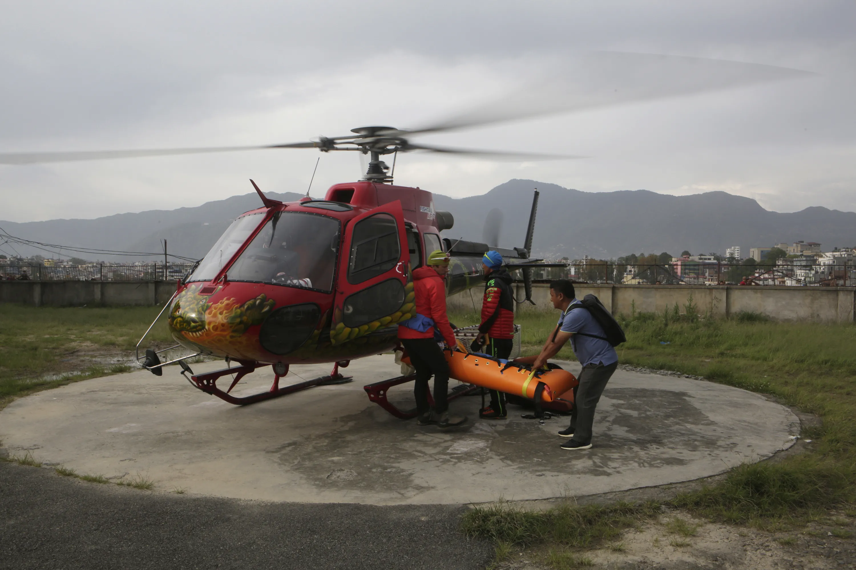 The body of famed Swiss climber Ueli Steck is unloaded from a helicopter at Teaching Hospital in Kathmandu, Nepal, April 30, 2017. 40-year-old Steck, one of the most-renowned mountaineers of his generation, was killed Sunday in a mountaineering accident near Mount Everest in Nepal, expedition organizers said. He was best known for his speed-climbing, including setting several records for ascending the north face of the Eiger, a classic mountaineering peak in the Bernese Alps that he climbed in two hours and 47 minutes without using a rope. (Photo by Niranjan Shrestha/AP Photo)