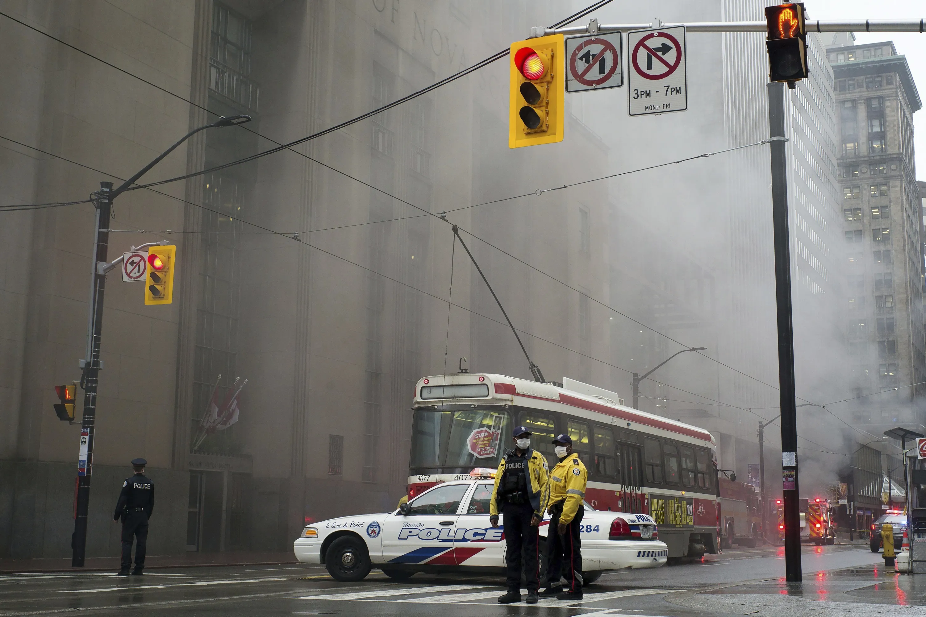 Police block the street as smoke pours into the air following a series of loud blasts were heard in Toronto on Monday, May 1, 2017. (Photo by Graeme Roy/The Canadian Press via AP Photo)