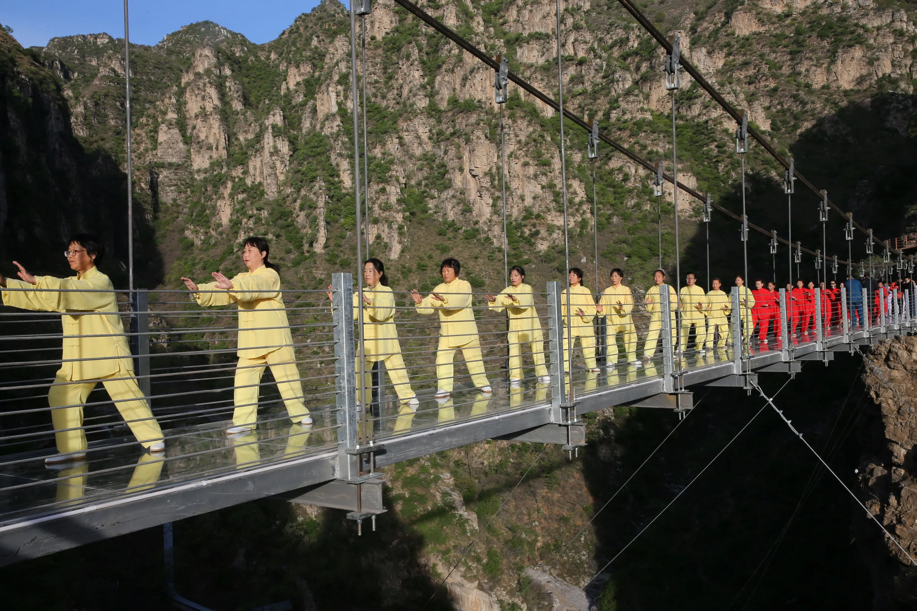 People practise tai chi on a suspension bridge in Beijing, China on April 23, 2017. (Photo by Reuters/China Stringer Network)