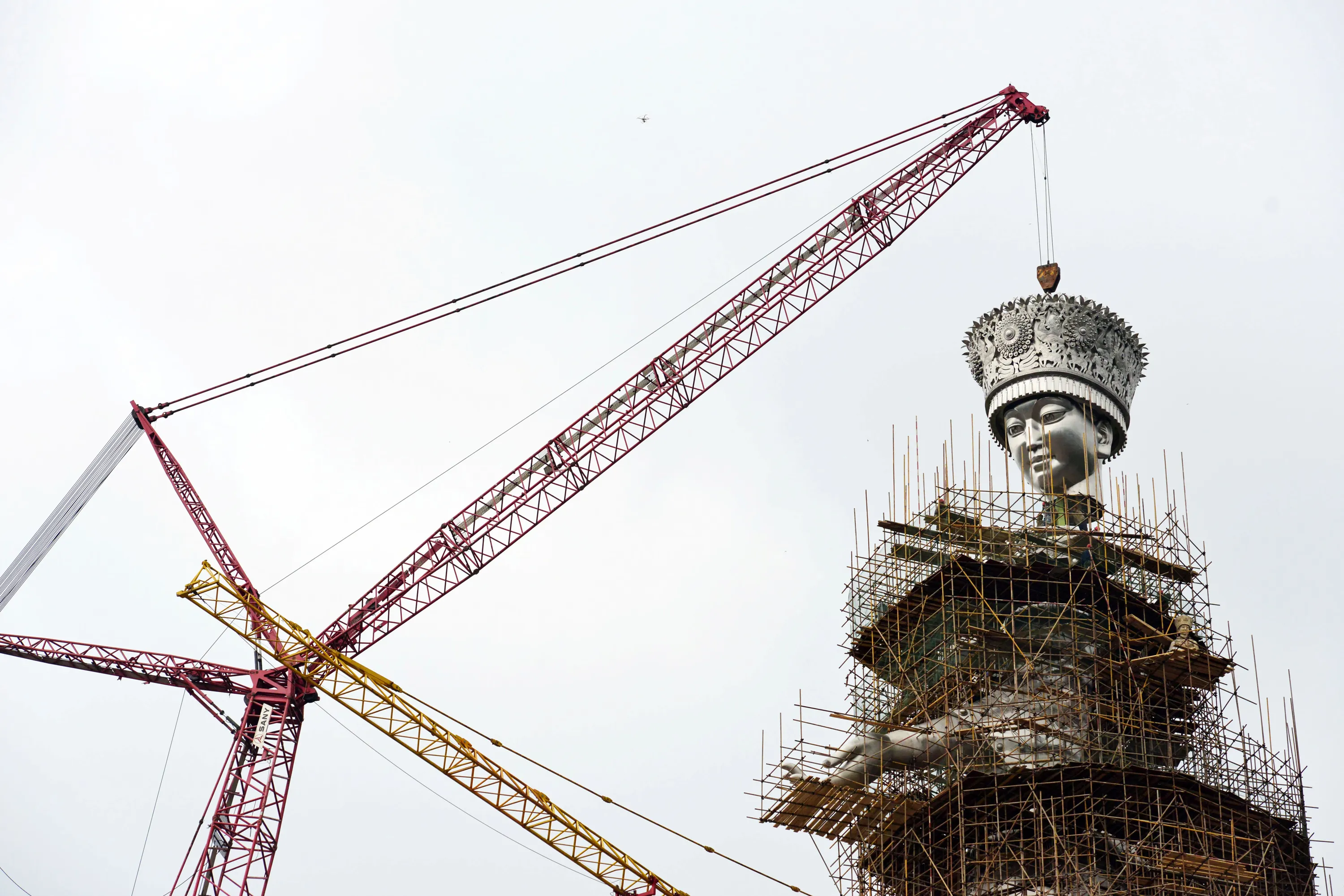 Head of a legendary ethnic Miao goddess statue is lifted at the construction site of the statue, in Jianhe County, Guizhou Province, April 15, 2017. (Photo by Reuters/Stringer)
