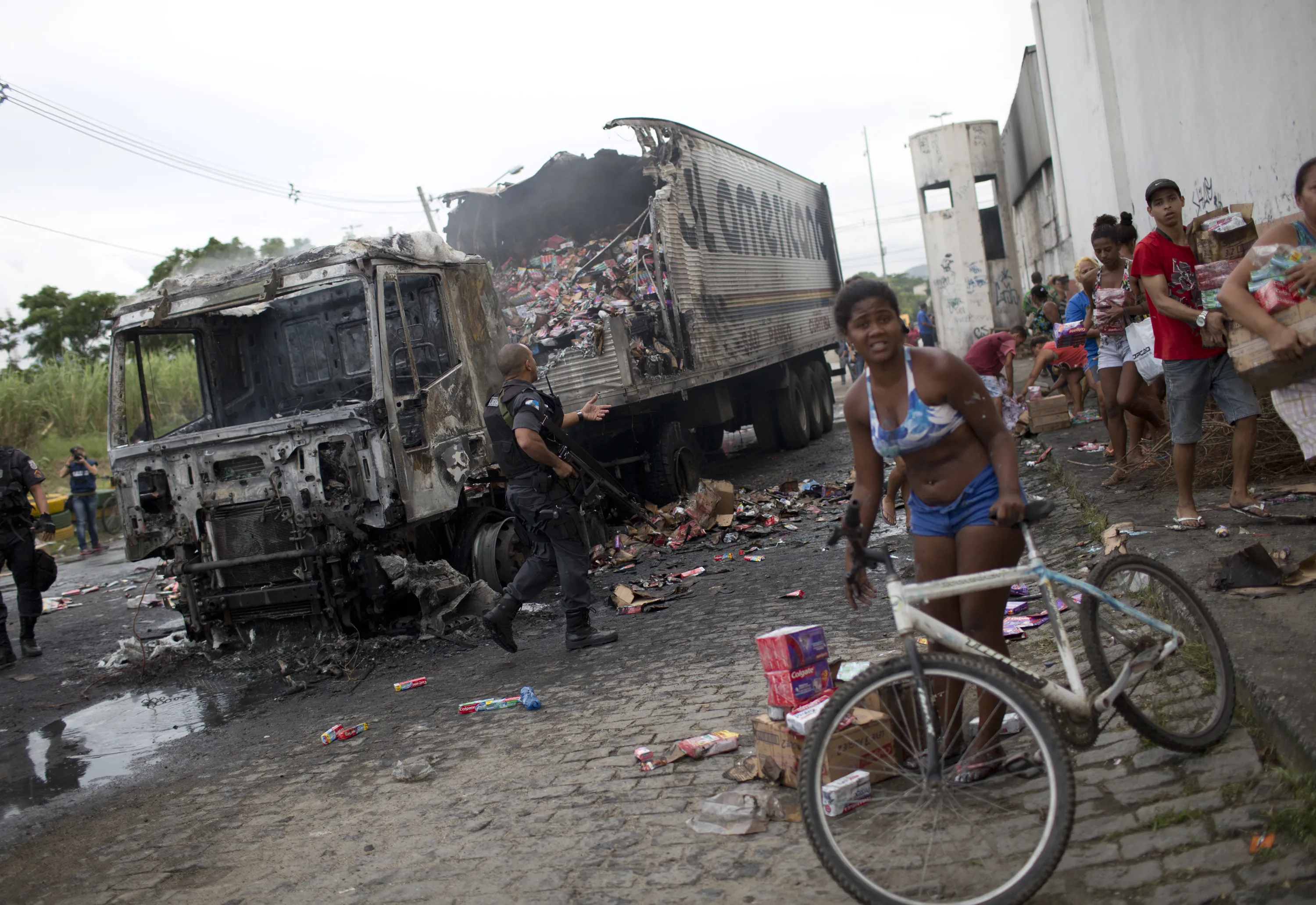 Residents walk past with merchandise they took from a cargo truck, left, allegedly set on fire by drug traffickers, in Rio de Janeiro, Brazil, Tuesday, May 2, 2017. (Photo by Silvia Izquierdo/AP Photo)