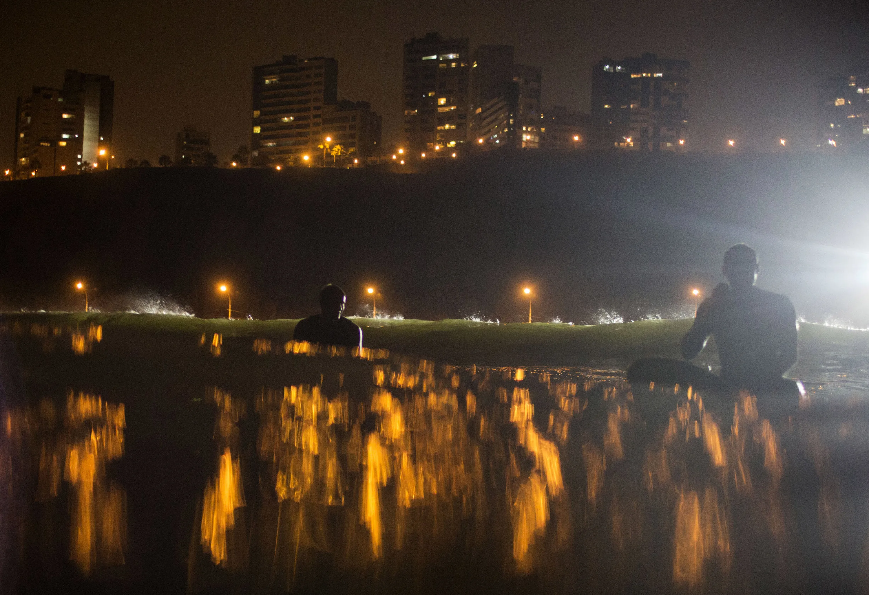 In this March 13, 2017 photo, surfers wait for the right wave to catch in La Pampilla beach, Lima, Peru. The beach does not attract sharks, unlike some beaches in the United States and Australia. The greatest danger faced by night surfers is that they can crash into each other, blinded by the powerful floodlights. (Photo by Rodrigo Abd/AP Photo)