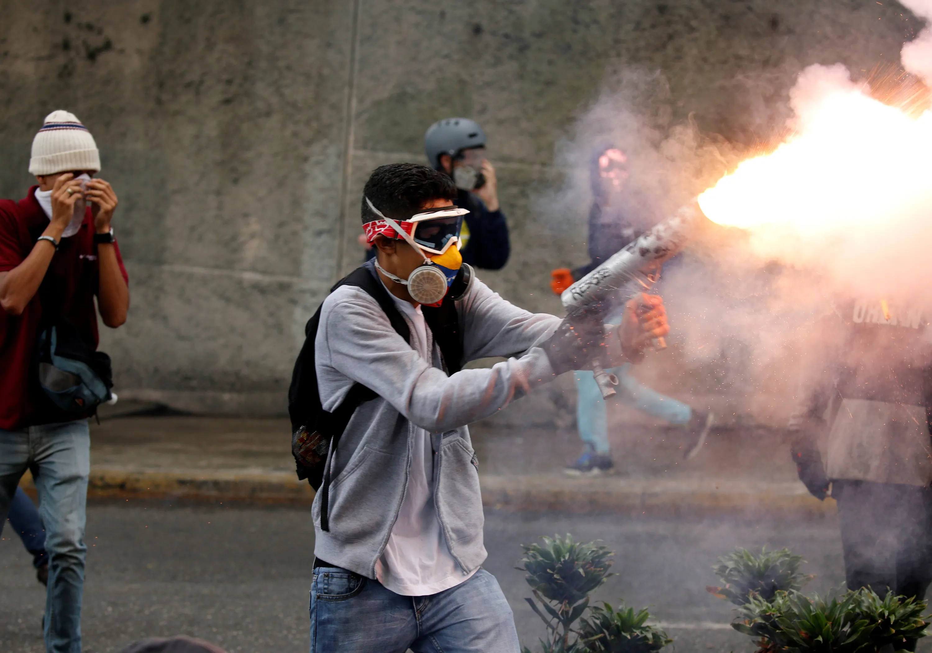 Demonstrator fires a homemade mortar during rally against Venezuela's President Nicolas Maduro in Caracas, Venezuela on May 3, 2017. (Photo by Carlos Garcia Rawlins/Reuters)