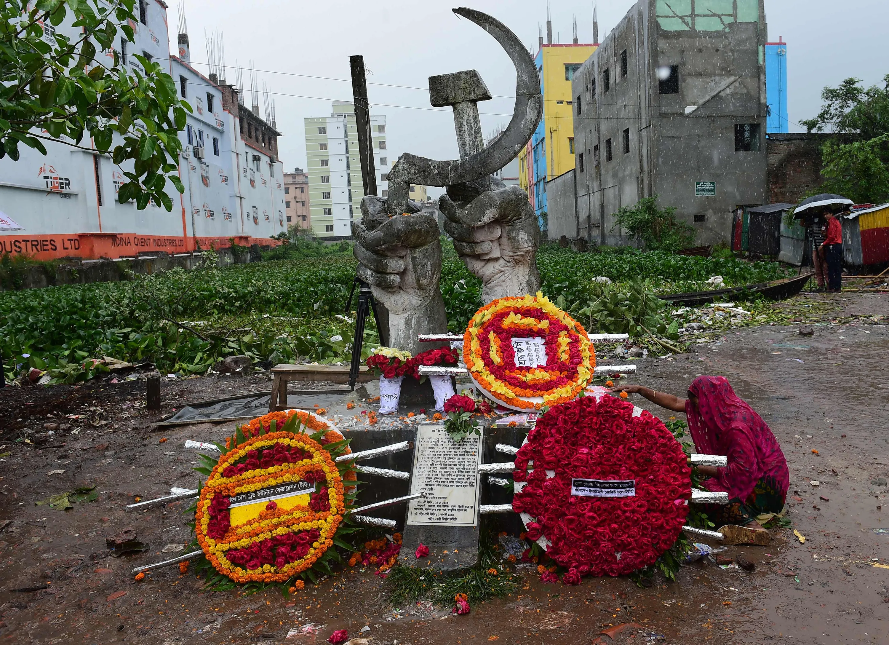 A Bangaldeshi relative of a victim kiled in the Rana Plaza building collapse sit next to a monument as she marks the fourth anniversary of the disaster at the site where the building once stood in Savar, on the outskirts of Dhaka, on April 24, 2017. Thousands of Bangladeshi garment workers staged a tearful demonstration April 24 to mark the anniversary of a factory disaster that killed 1,138 people, demanding justice for the victims and better pay. (Photo by AFP Photo/Stringer)