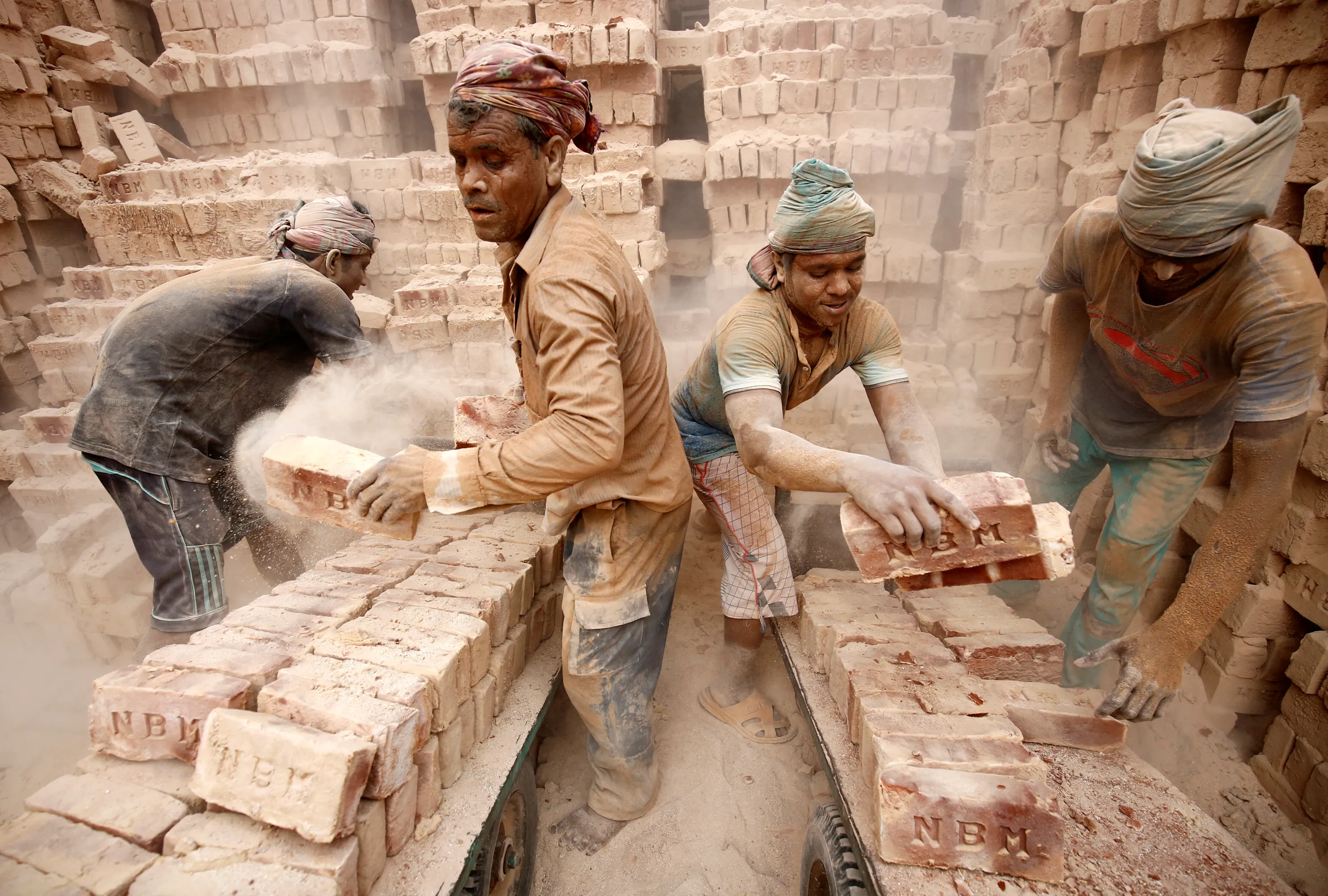 Brick factory workers load carts with bricks to take them into warehouse in Dhaka, Bangladesh, April 19, 2017. (Photo by Mohammad Ponir Hossain/Reuters)