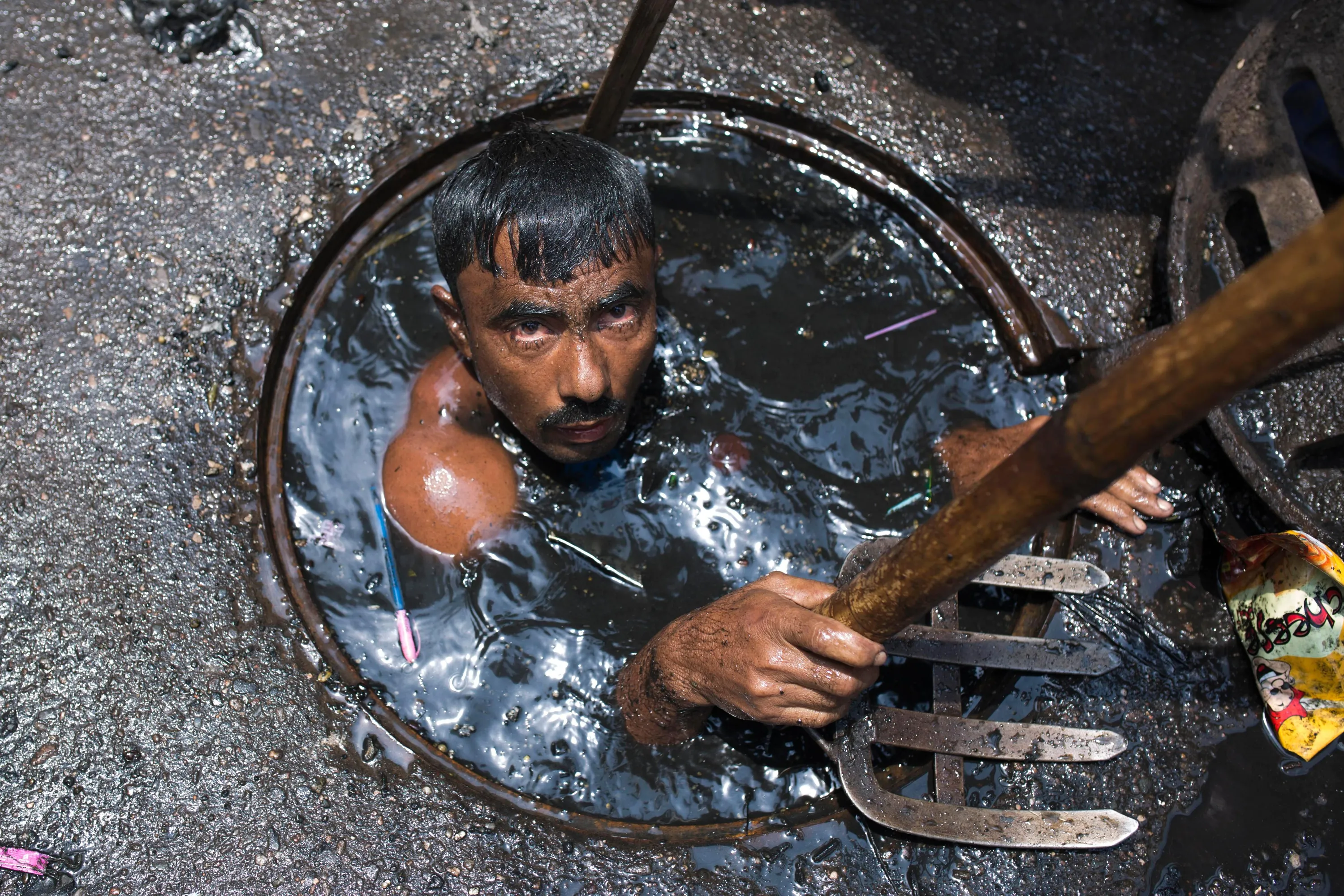 A sewer cleaner of Dhaka City Corporation cleaning out the city's sewers on May 03, 2017 in Dhaka, Bangladesh. Despite a rise in the number of deaths of manhole workers every year, workers regularly go into the manholes without any protective gear. (Photo by Zakir Chowdhury/Barcroft Images)