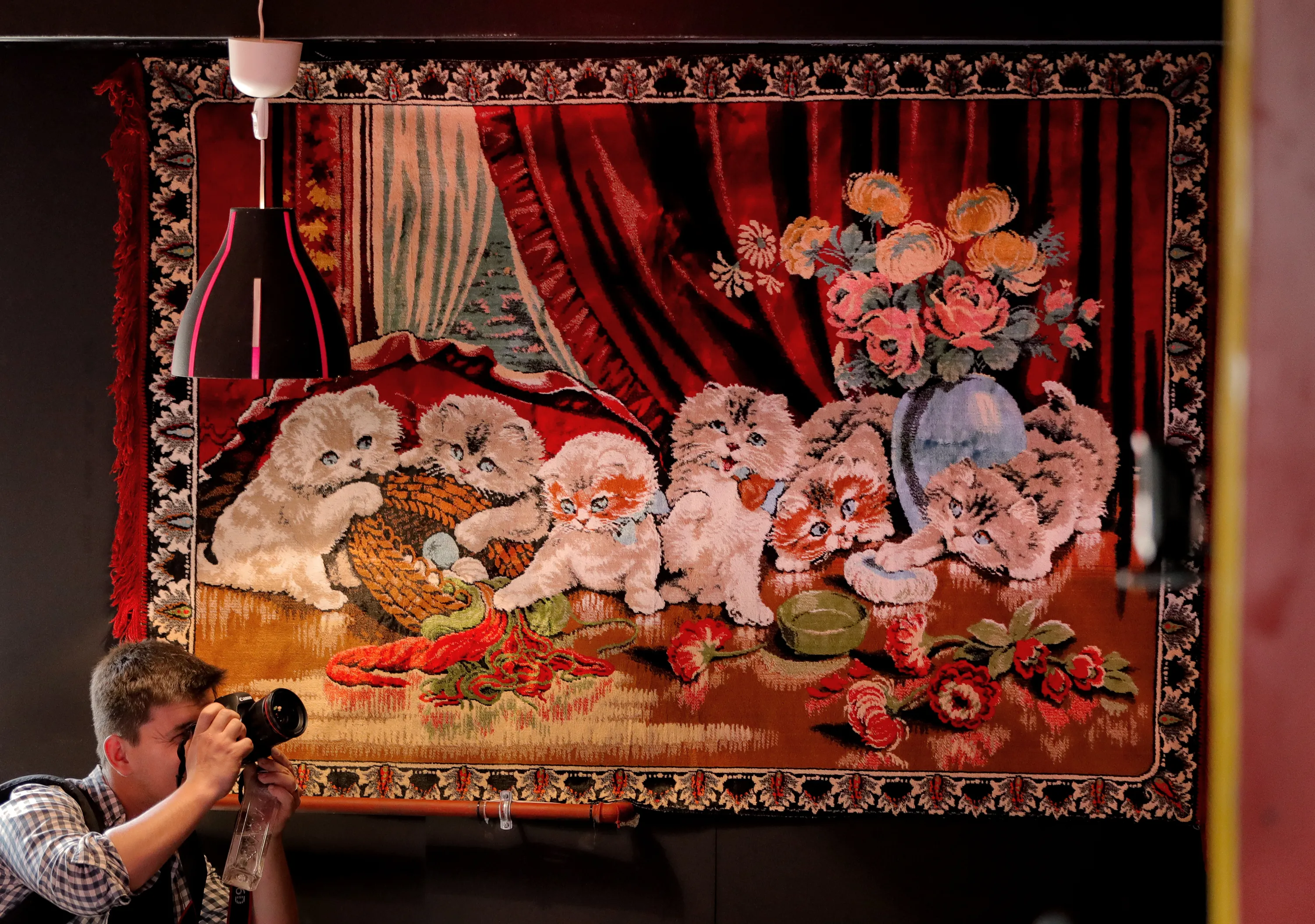 In this Thursday, May 4, 2017, photo a news photographer works inside the newly opened Bucharest Kitsch Museum, in Bucharest, Romania. The Kitsch Museum opens for visitors on Friday, May 5, 2017. (Photo by Vadim Ghirda/AP Photo)