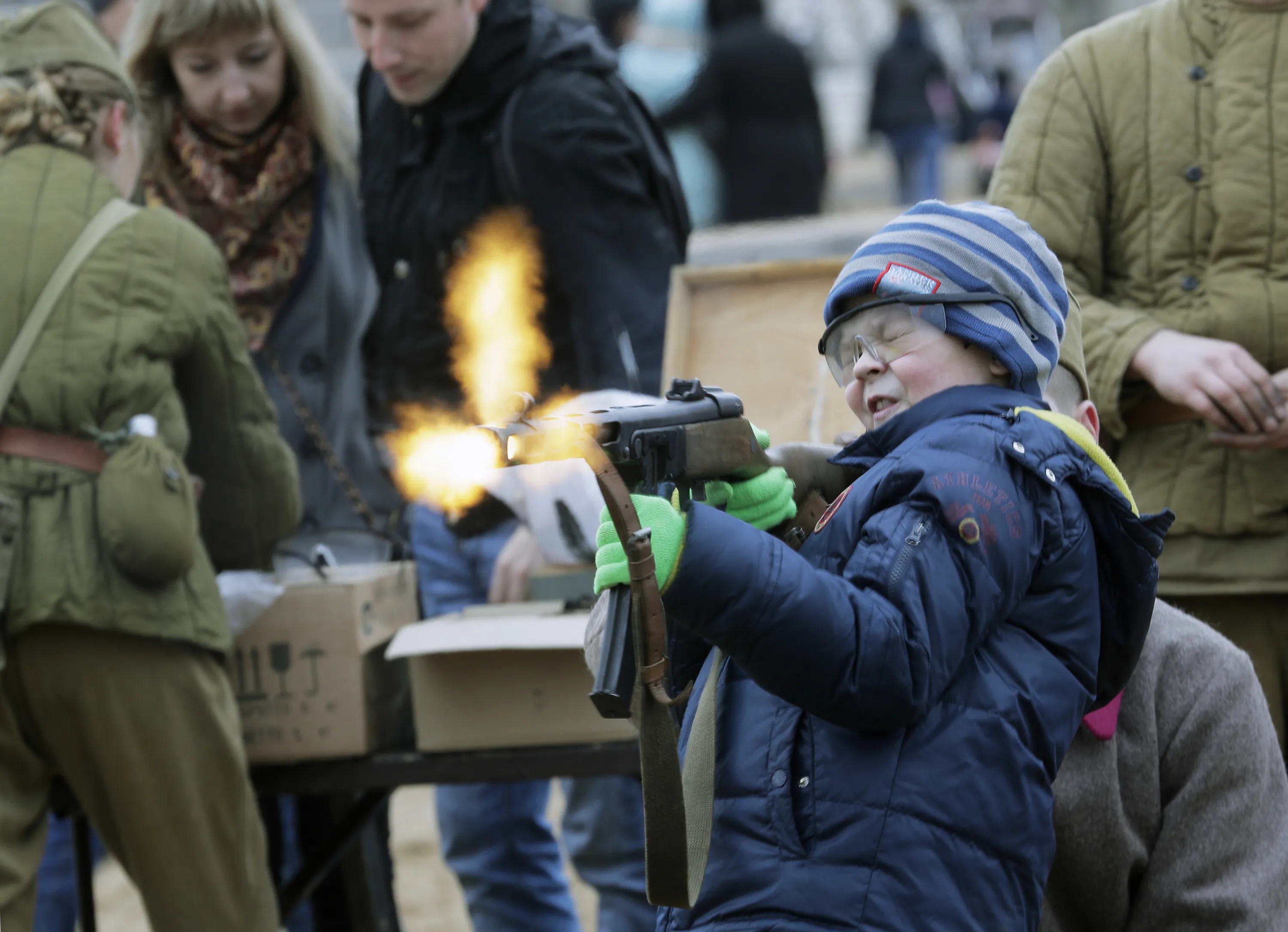 A boy shoots a World War II-era machine gun armed with blanks at a weapon exhibition during a military show in St. Petersburg, Russia, on Sunday, April 30, 2017. (Photo by Dmitri Lovetsky/AP Photo)