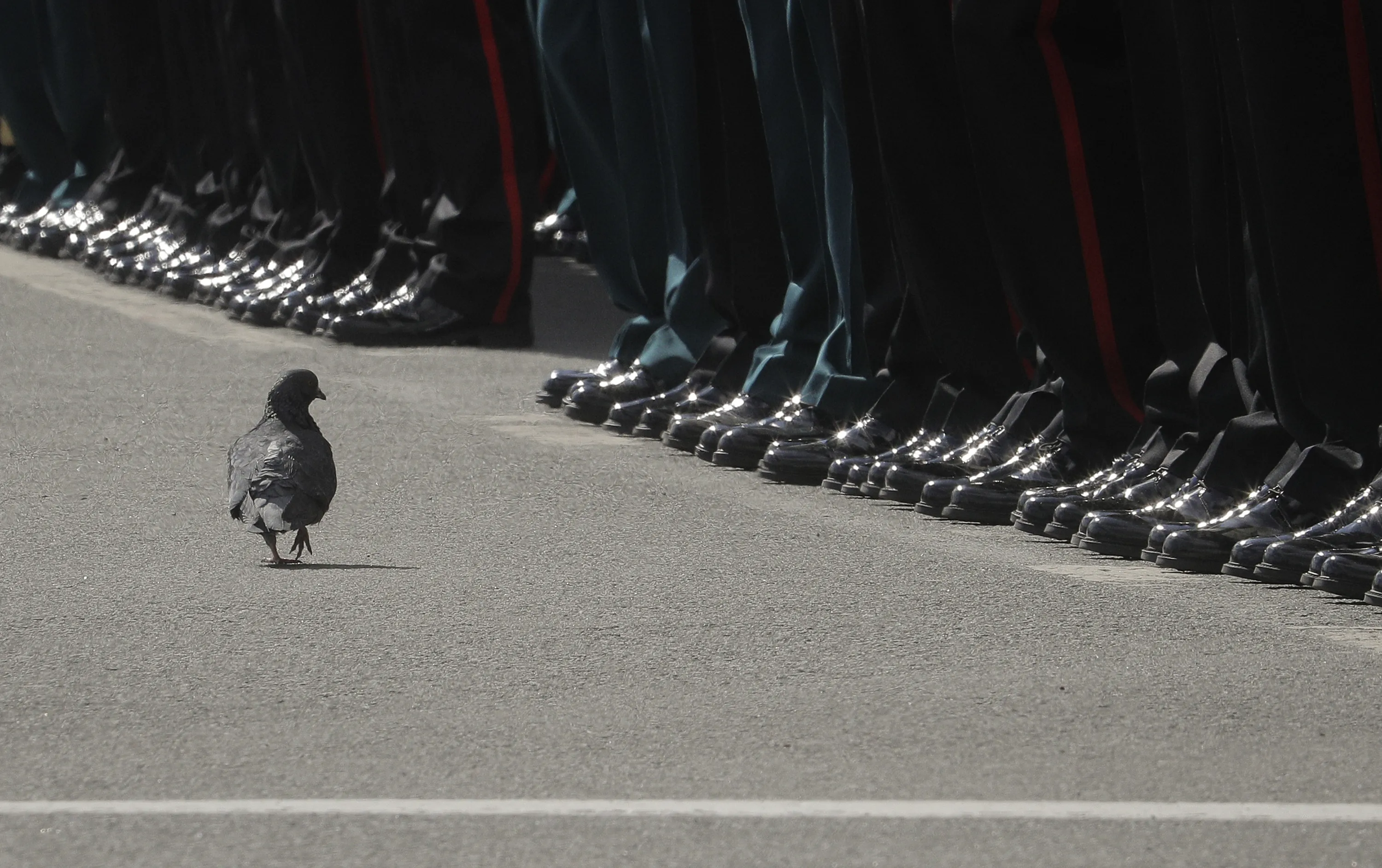 A pigeon walks in front of the ranks of soldiers during the Victory Day military parade in St. Petersburg, Russia, on Tuesday, May 9, 2017. (Photo by Dmitri Lovetsky/AP Photo)