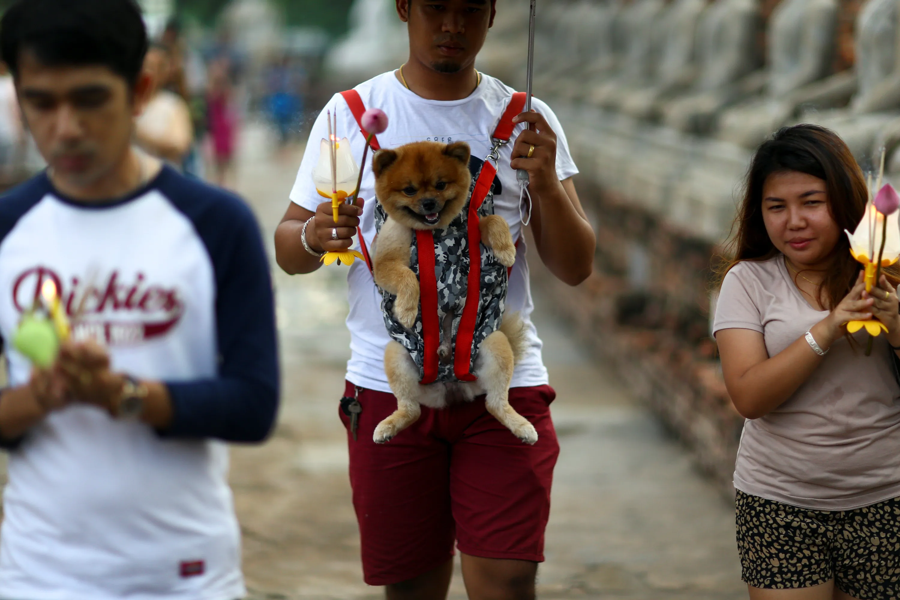 A man carries his dog as he prays during Vesak Day, an annual celebration of Buddha's birth, enlightenment and death, at Wat Yai Chai Mongkhon temple in Ayutthaya, Thailand, May 10, 2017. (Photo by Athit Perawongmetha/Reuters)