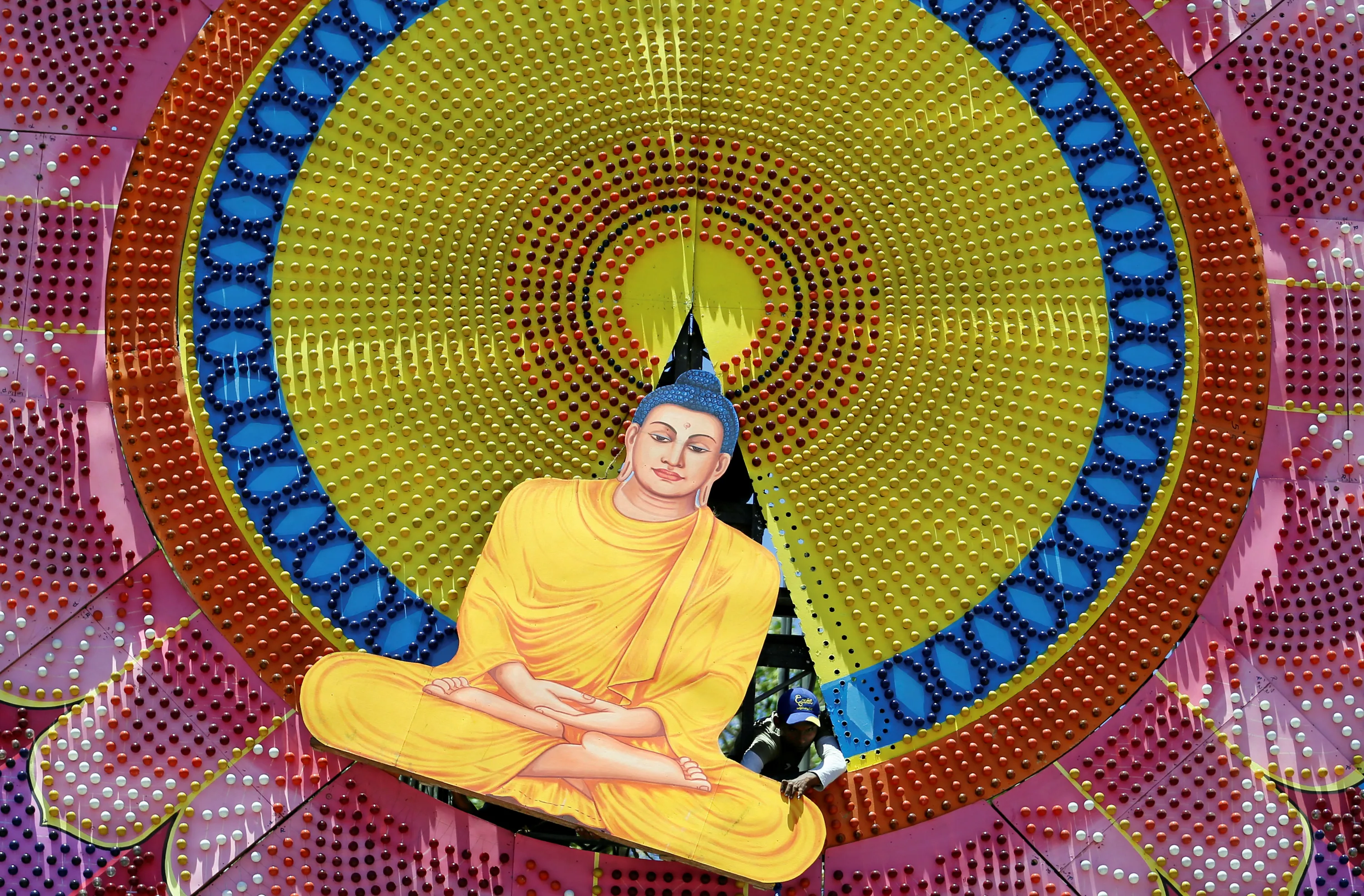 A man fixes an image of a Buddha on top of a pandal, a temporary platform to be decorated with illuminated panels illustrating episodes from the life of Buddha, ahead of Vesak Day celebrations, during which Sri Lankan Buddhists commemorate the birth, enlightenment and death of Buddha in Colombo, Sri Lanka on May 8, 2017. (Photo by Dinuka Liyanawatte/Reuters)