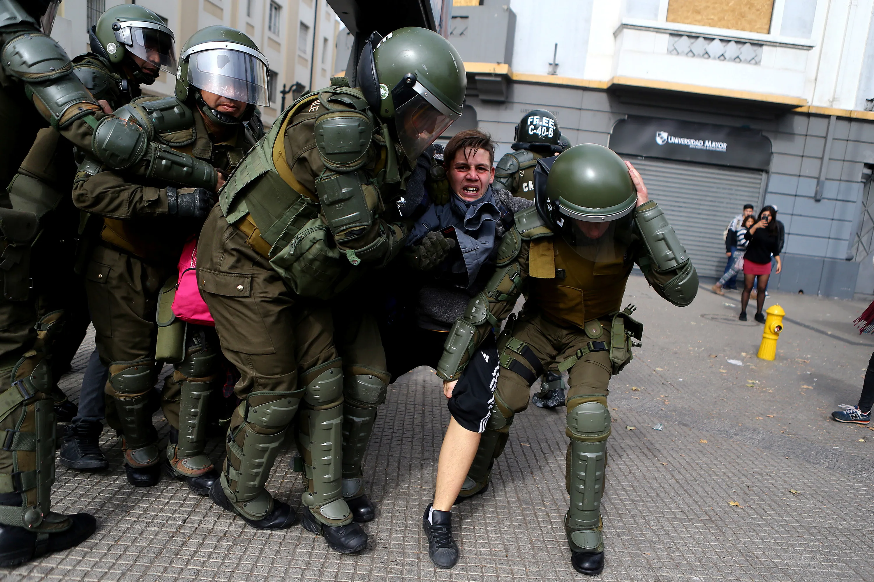 A demonstrator is detained during clashes with riot police at a students' march for a better education reform in Santiago, Chile on May 9, 2017. (Photo by Ivan Alvarado/Reuters)