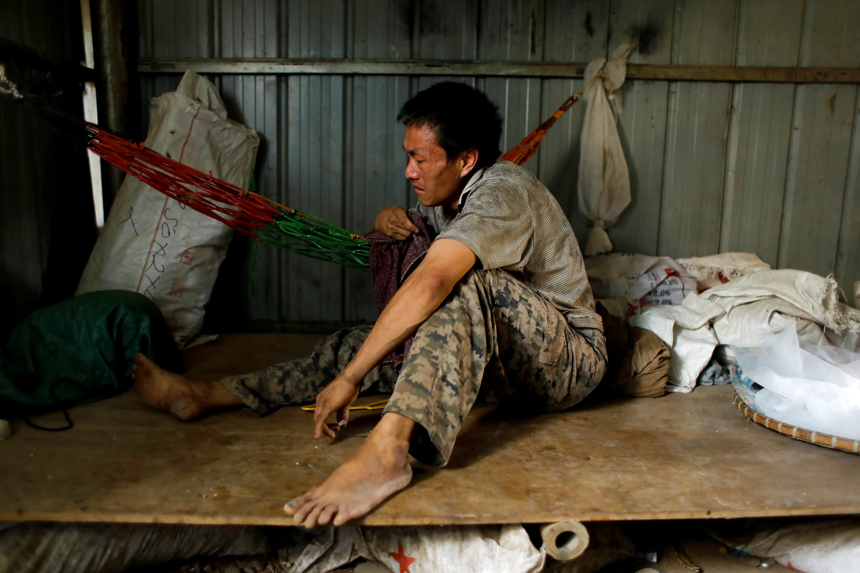 A banana plantation worker cries as he sits inside his shack during a day off at a plantation operated by a Chinese company in the province of Bokeo in Laos April 26, 2017. (Photo by Jorge Silva/Reuters)