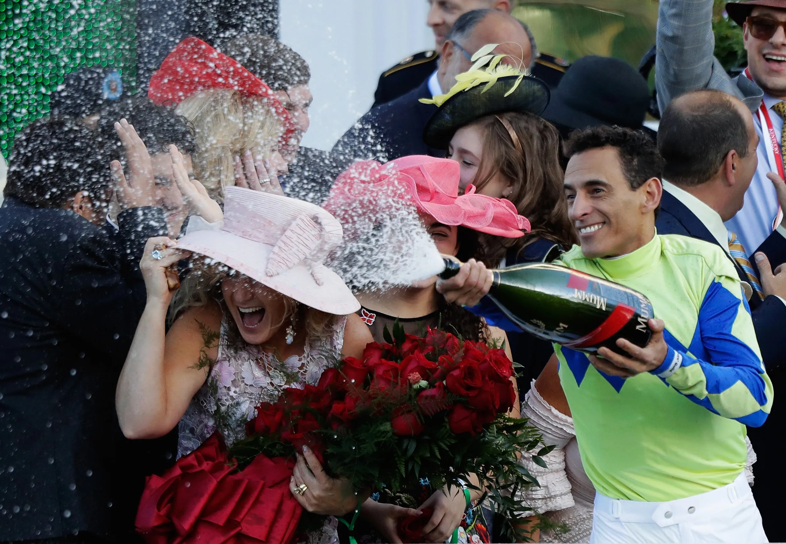 Jockey John Velazquez sprays champagne in the winner's circle after guiding Always Dreaming to win the 143rd running of the Kentucky Derby at Churchill Downs on May 6, 2017 in Louisville, Kentucky. (Photo by Andy Lyons/Getty Images)