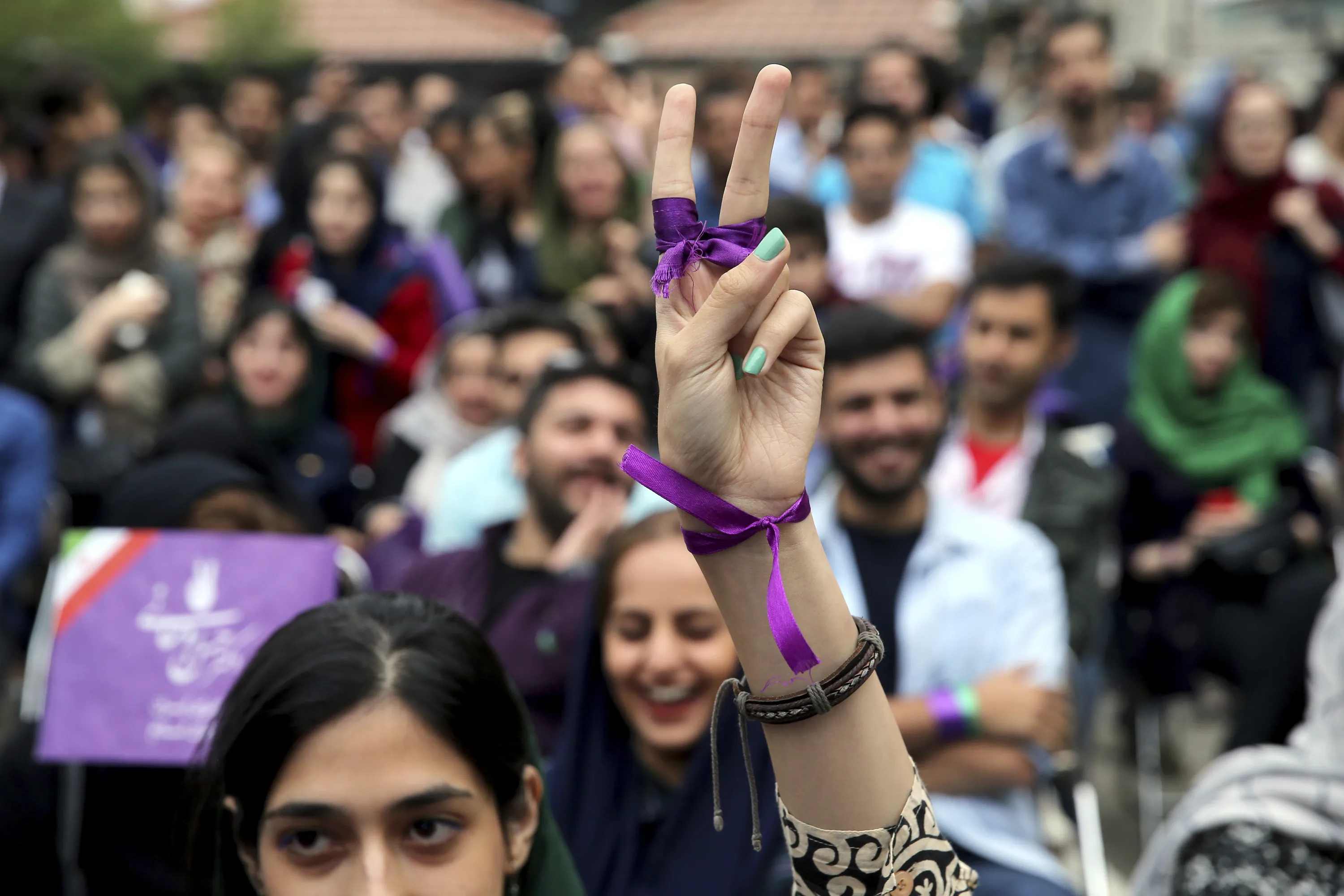 A supporter of Iran's President Hassan Rouhani, who is running for a second term in office, makes V sign as she watches a live televised debate outside a Rouhani campaign headquarters in Tehran, Iran, Friday, May 12, 2017. Rivals of President Hassan Rouhani in the May 19 poll have renewed accusations of corruption and mismanagement against him during the last of three televised debates. (Photo by Ebrahim Noroozi/AP Photo)