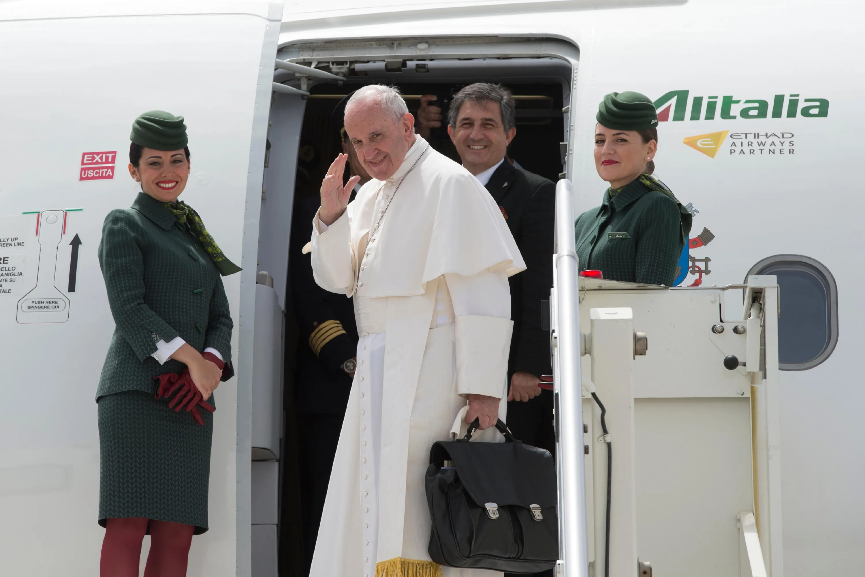Pope Francis waves as he embarks his flight to Monte Real, Portugal, from Fiumicino's International airport, near Rome, Italy, Friday, May 12, 2017. The pope is traveling to the Sanctuary of Our Lady of Fatima where on Saturday he will canonize two poor, illiterate shepherd children whose visions of the Virgin Mary 100 years ago marked one of the most important events of the 20th-century Catholic Church. (Photo by L'Osservatore Romano/Pool Photo via AP Photo)