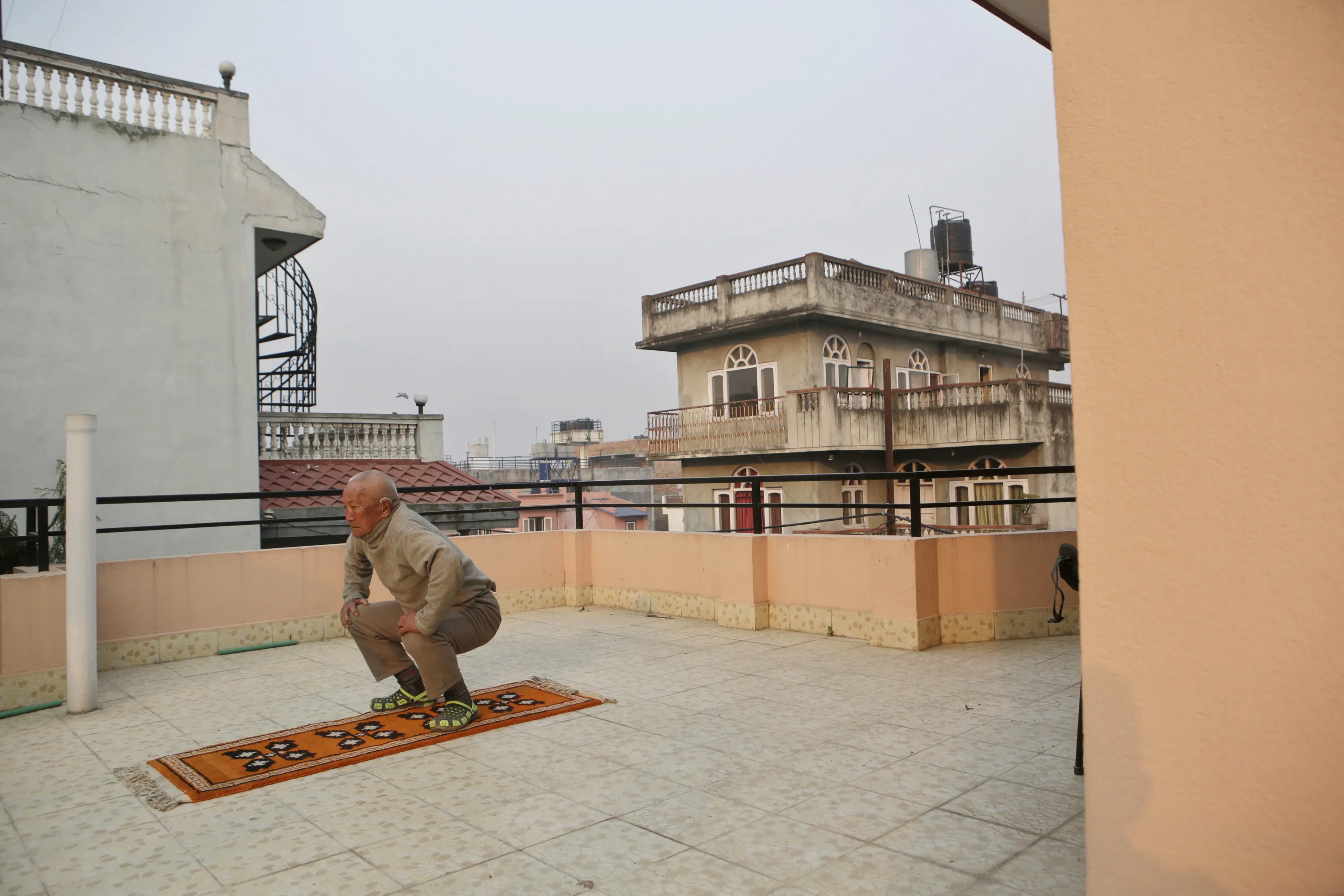 Nepalese mountain climber Min Bahadur Sherchan, does his morning Yoga at his residence in Kathmandu, Nepal, Wednesday, April 12, 2017. The 85-year-old climber who was once the oldest person to scale the world’s highest mountain is heading back to Mount Everest in hopes of scaling the peak and regaining the title. Sherchan is aiming to scale the peak next month when there is window of favorable weather on the summit. (Photo by Niranjan Shrestha/AP Photo)