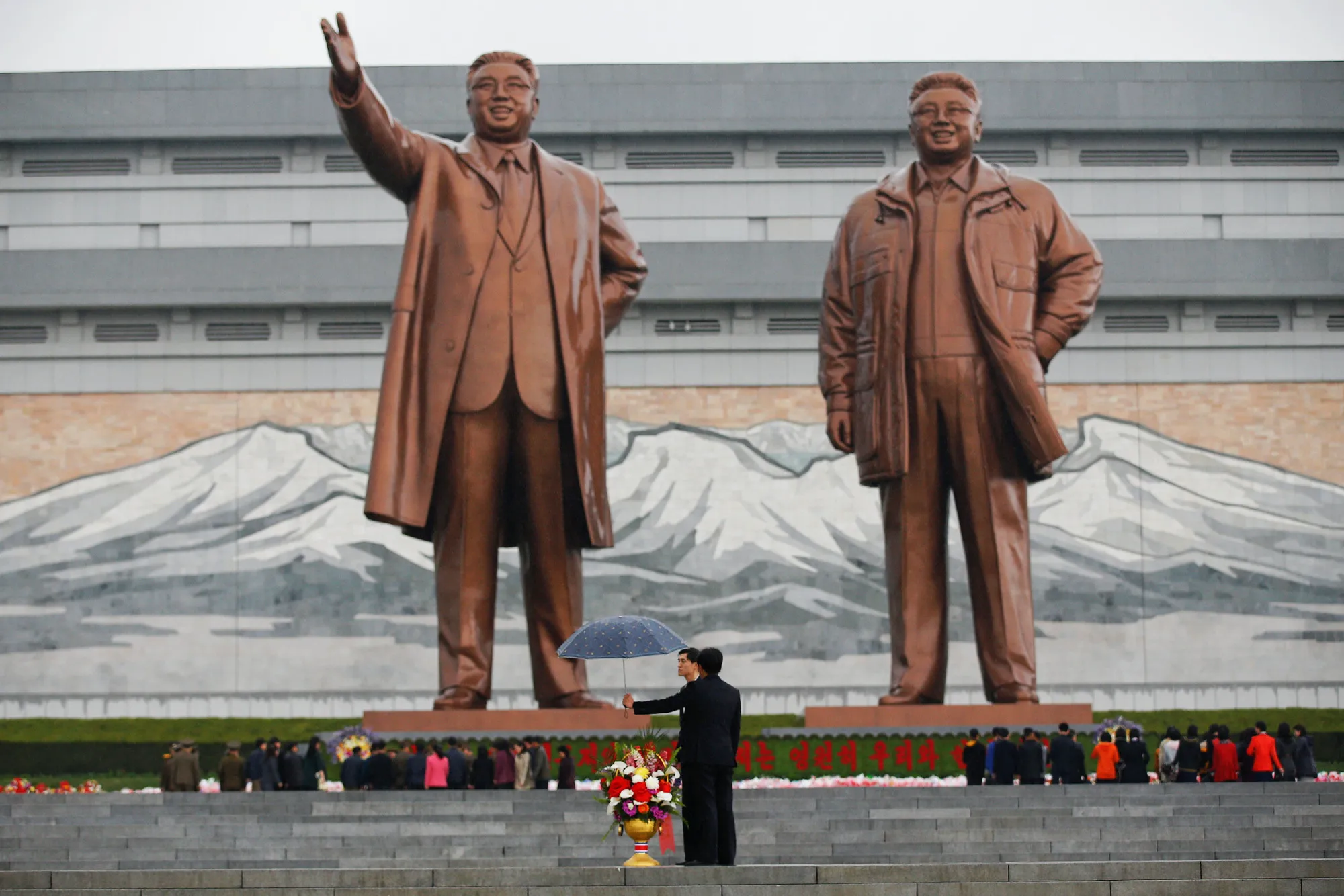 A man holds an umbrella over flowers as people gather to pay their respects at the statues of North Korea founder Kim Il Sung (L) and late leader Kim Jong Il in Pyongyang, North Korea April 14, 2017. (Photo by Damir Sagolj/Reuters)