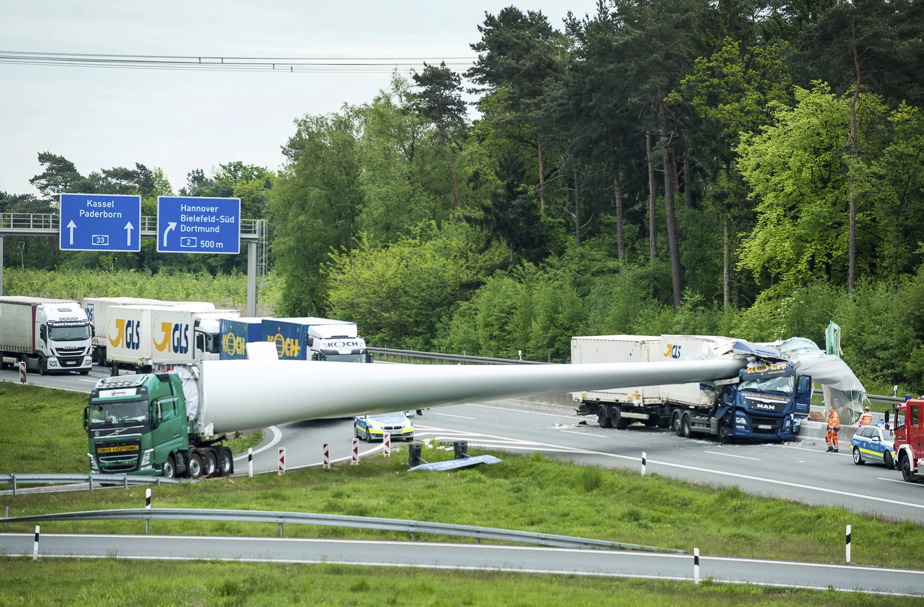 The wing of a wind turbine sticks in a truck after an accident on a motorway near Bielefeld, western Germany, Tuesday, May 16, 2017. The driver of the following truck was injured in the rear-end collision. (Photo by Christian Mathiesen/DPA via AP Photo)