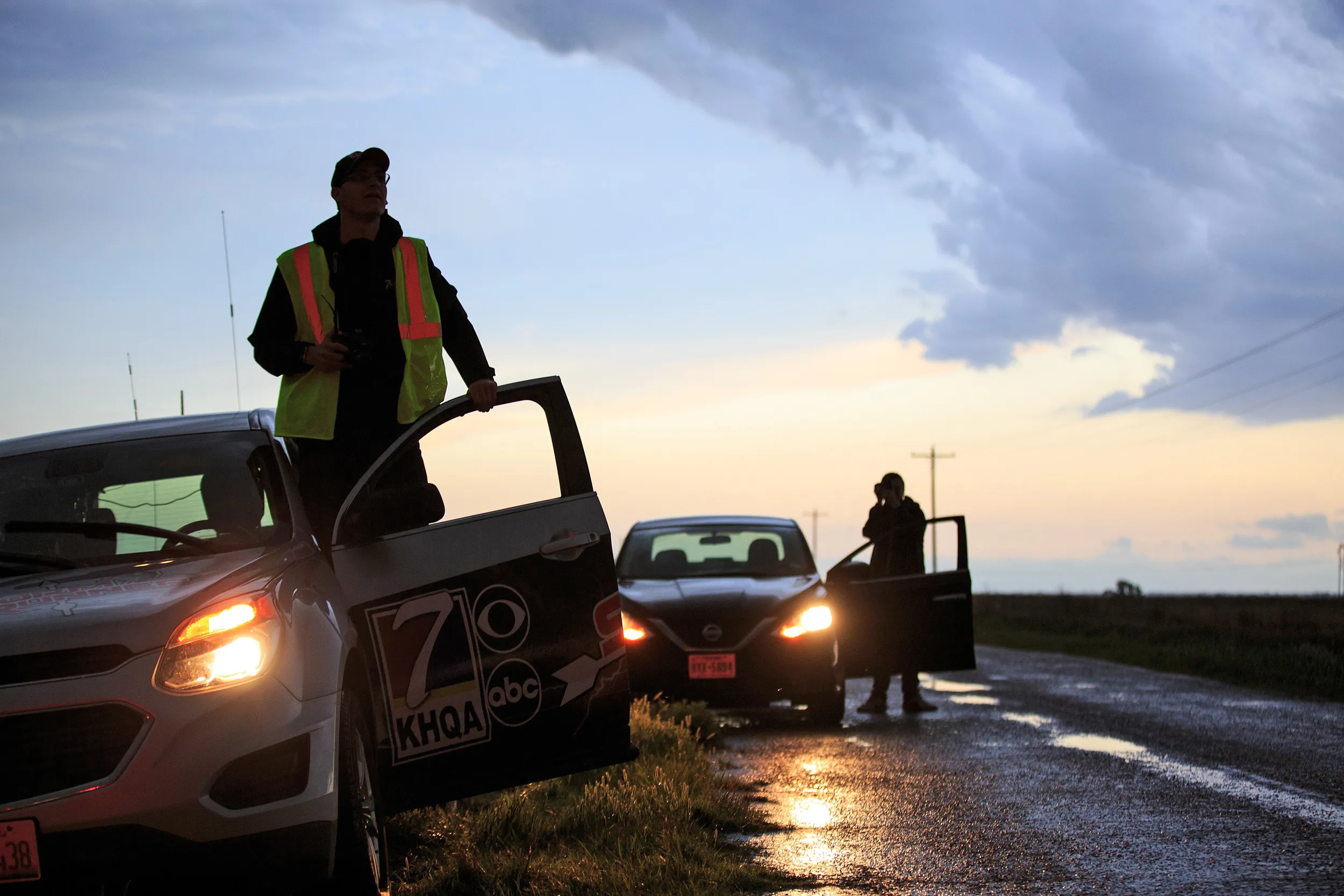 (L to R) Meteorologist Nicholas Stewart and Robin Duspara, who traveled to the U.S. from Prague and runs the Czech Thunderstorm Research Association, pull over and hop out of their cars to observe a supercell thunderstorm as it bears down on the area, May 9, 2017 in Lamb County, Texas. (Photo by Drew Angerer/Getty Images)
