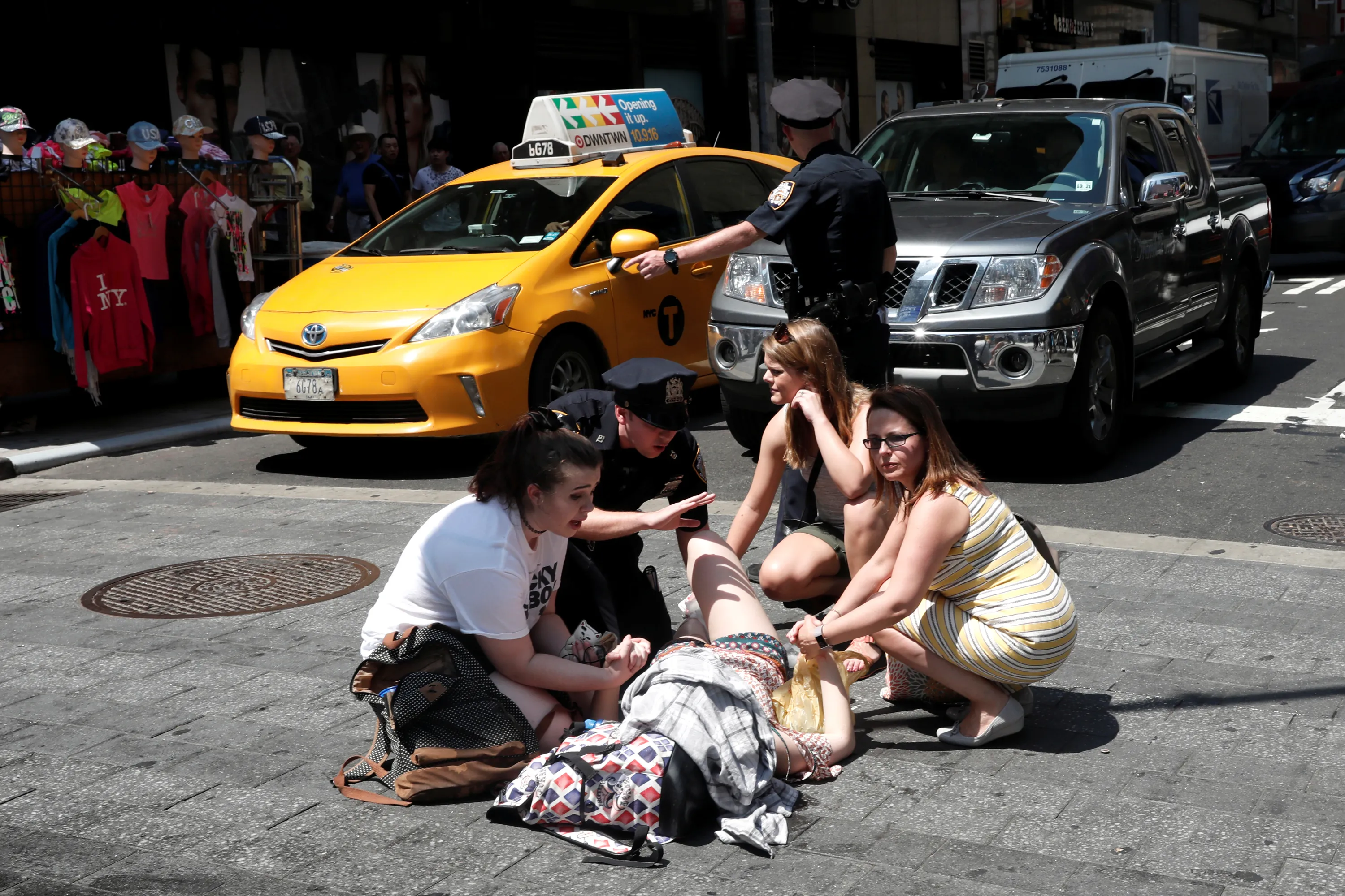 An injured woman is seen at a crosswalk in Times Square after a speeding vehicle struck pedestrians on the sidewalk in New York City, May 18, 2017. (Photo by Mike Segar/Reuters)