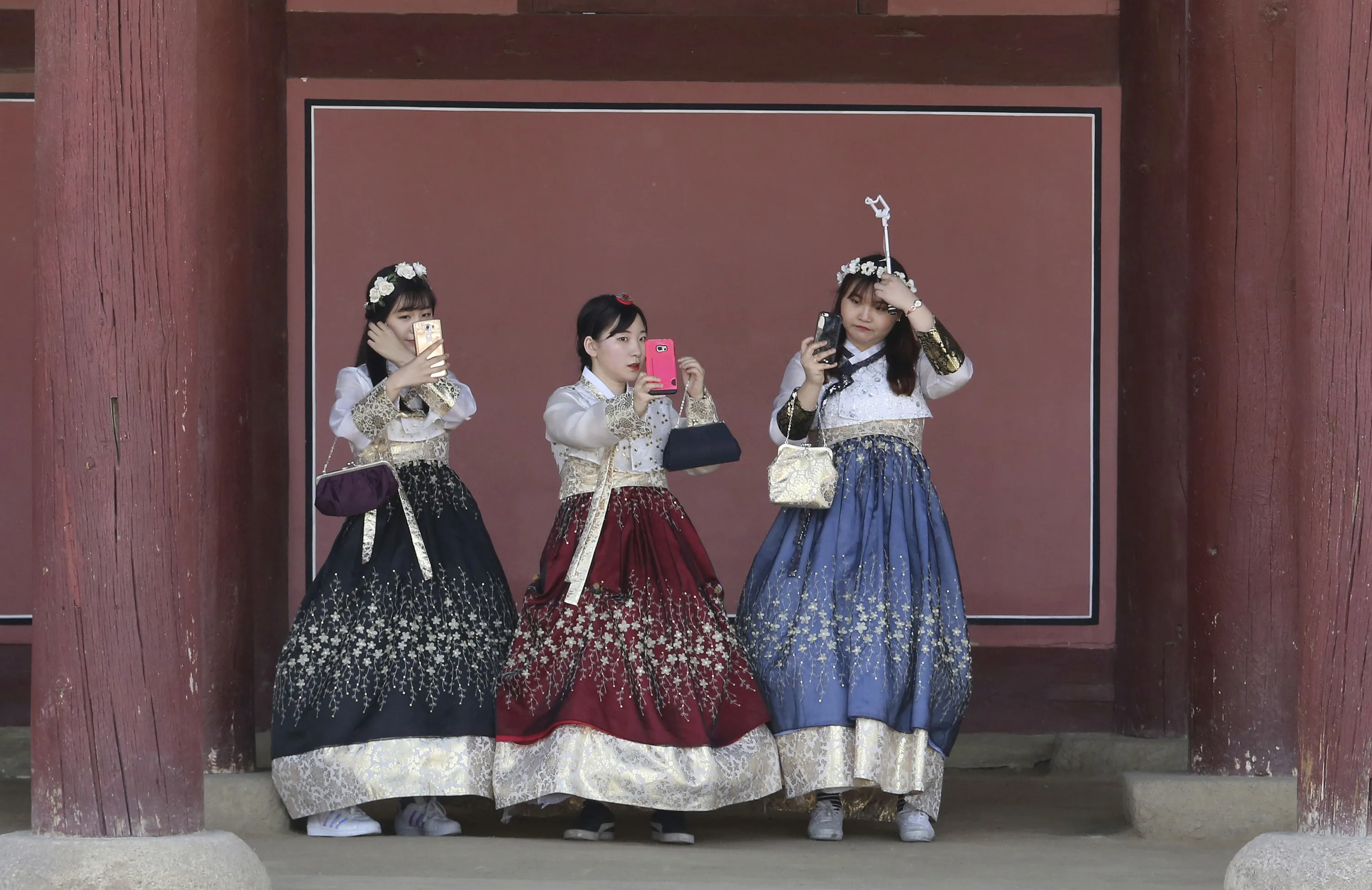 Women dressed in South Korean traditional “Hanbok” attire adjust their hair to take pictures at the Gyeongbok Palace, the main royal palace during the Joseon Dynasty, in Seoul, South Korea, Thursday, May 18, 2017. Wearing a “Hanbok”, mostly rented, has become a fashionable trend among the youth commonly seen at palaces and other traditional places. (Photo by Ahn Young-joon/AP Photo)