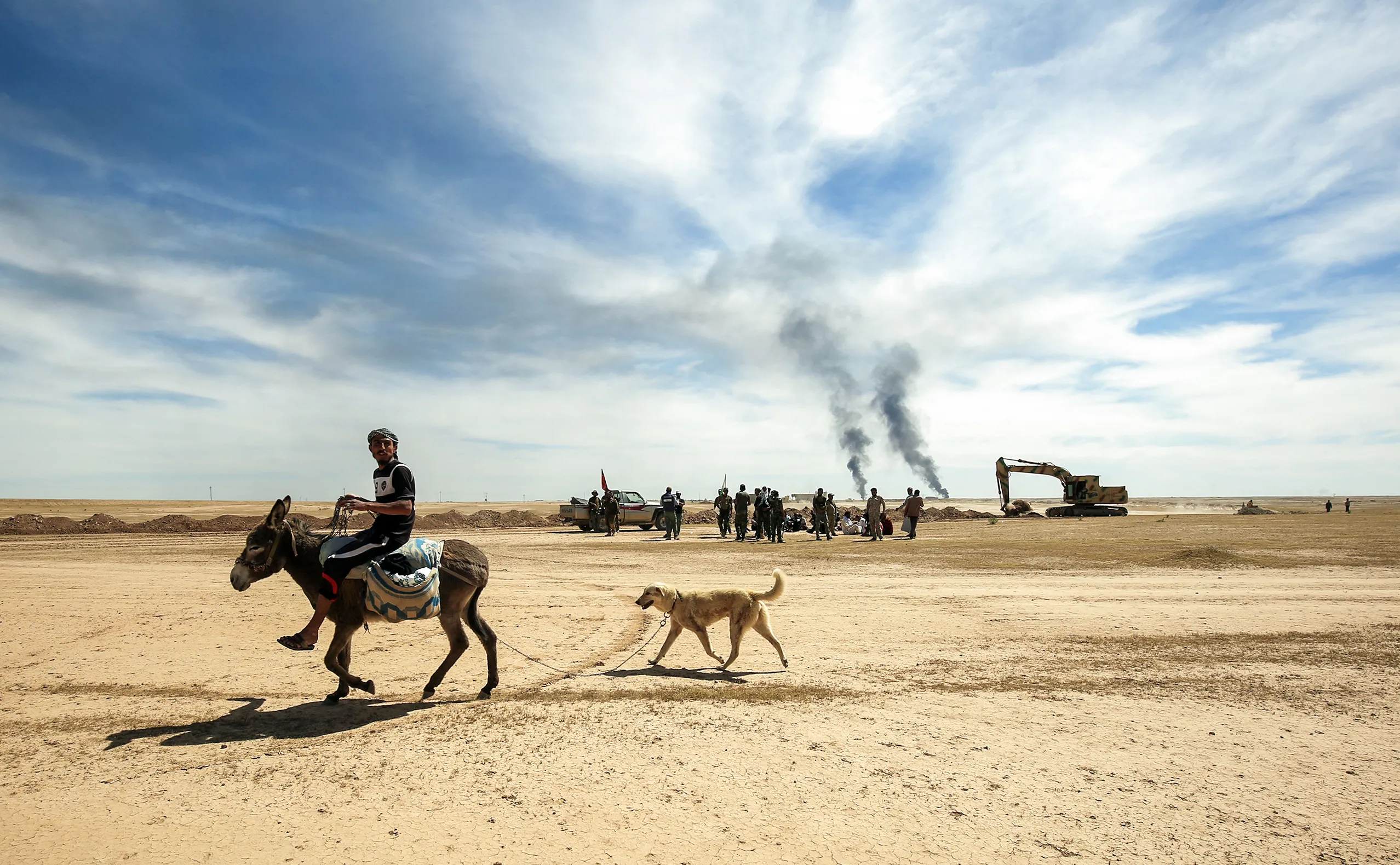 A diplaced Iraqi man rides a donkey, followed by his dog as pro-government Hashed al-Shaabi (Popular Mobilisation) paramilitary forces advance towards the UNESCO-listed ancient city of Hatra, southwest of the northern city of Mosul, during an offensive to retake the area from Islamic State (IS) group fighters, on April 26, 2017. Hatra is the latest important archaeological site to be recaptured from IS. Jihadists had embarked on a campaign of destruction against archaeological sites after they seized swathes of Iraq and Syria in a lightning 2014 offensive. The full extent of the harm to Hatra remains unclear. (Photo by Ahmad Al-Rubaye/AFP Photo)