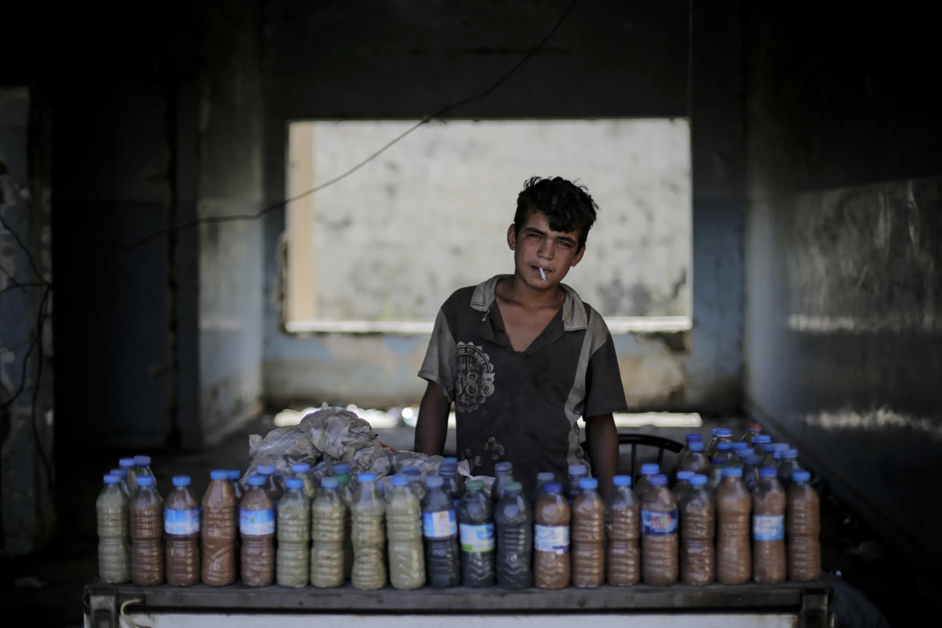 Abdul Aziz, 15, smokes a cigarette while waiting for customers to buy the mud from a sulphur well near the Hamam Alil spa south of Mosul, Iraq on Thursday, April 27, 2017. The mud is supposedly healthy for the skin. Before the Islamic State took over the town of Hamam Alil in 2014, people from all over Iraq visited the historic spa. (Photo by Bram Janssen/AP Photo)