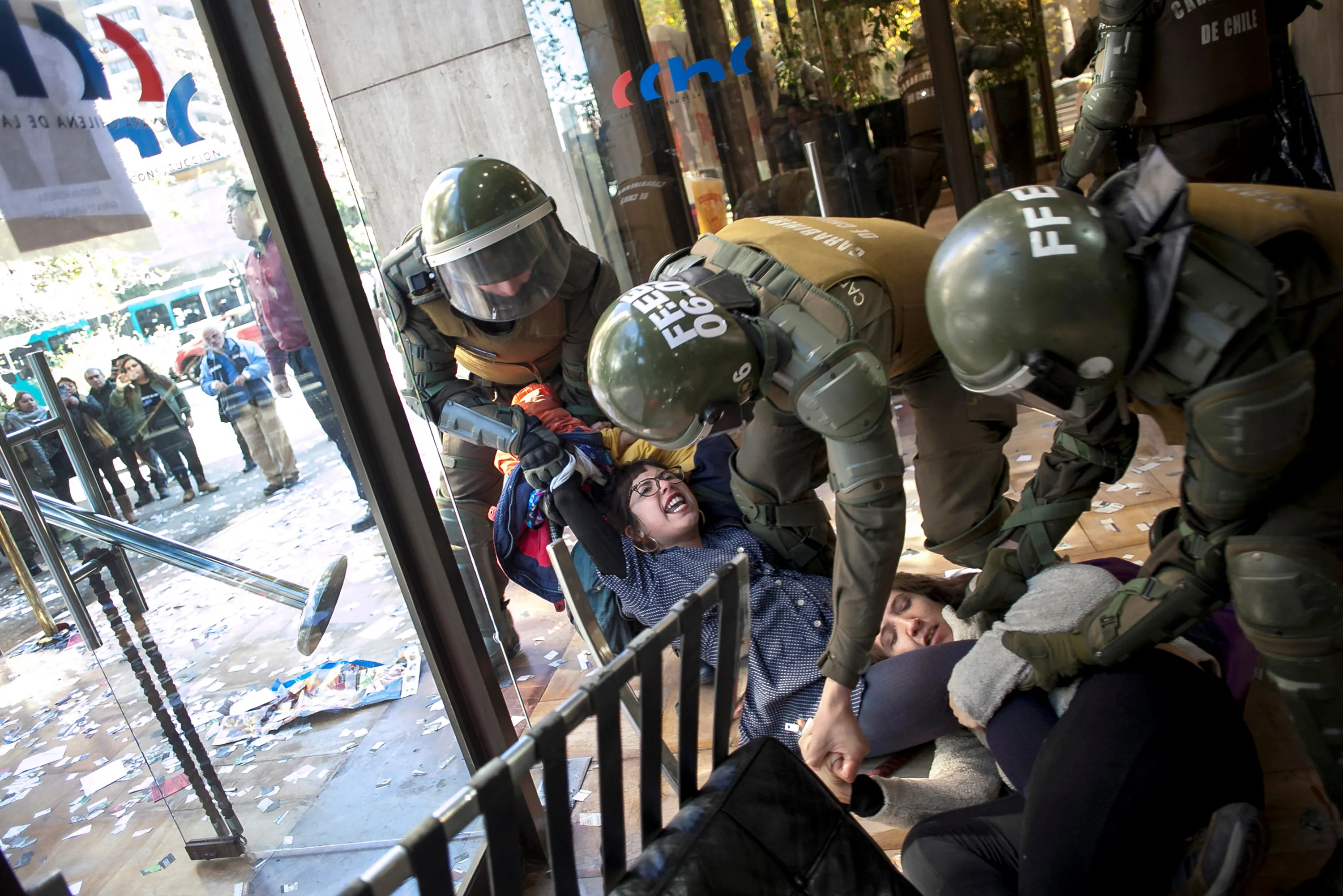 A demonstrators is detained by riot police during a protest inside the headquarters of the Chilean Chamber of Construction, demanding housing solutions for their neighbourhoods in Santiago, Chile May 19, 2017. (Photo by Cristobal Saavedra/Reuters)