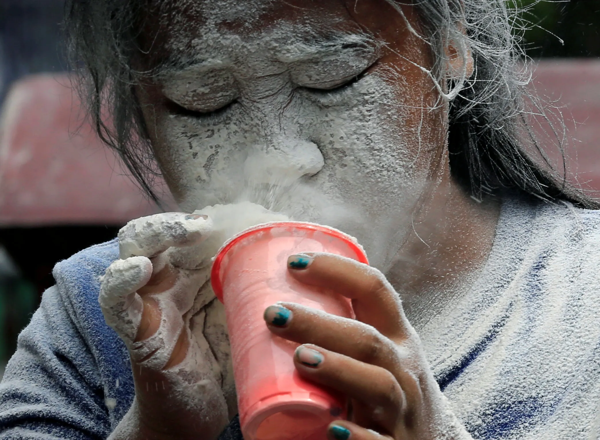 A girl's face is covered by a white powder after blowing on it, while participating in a game during a religious festival honouring patron saint Santa Rita de Cascia in Paranaque city, Metro Manila, Philippines May 21, 2017. (Photo by Romeo Ranoco/Reuters)