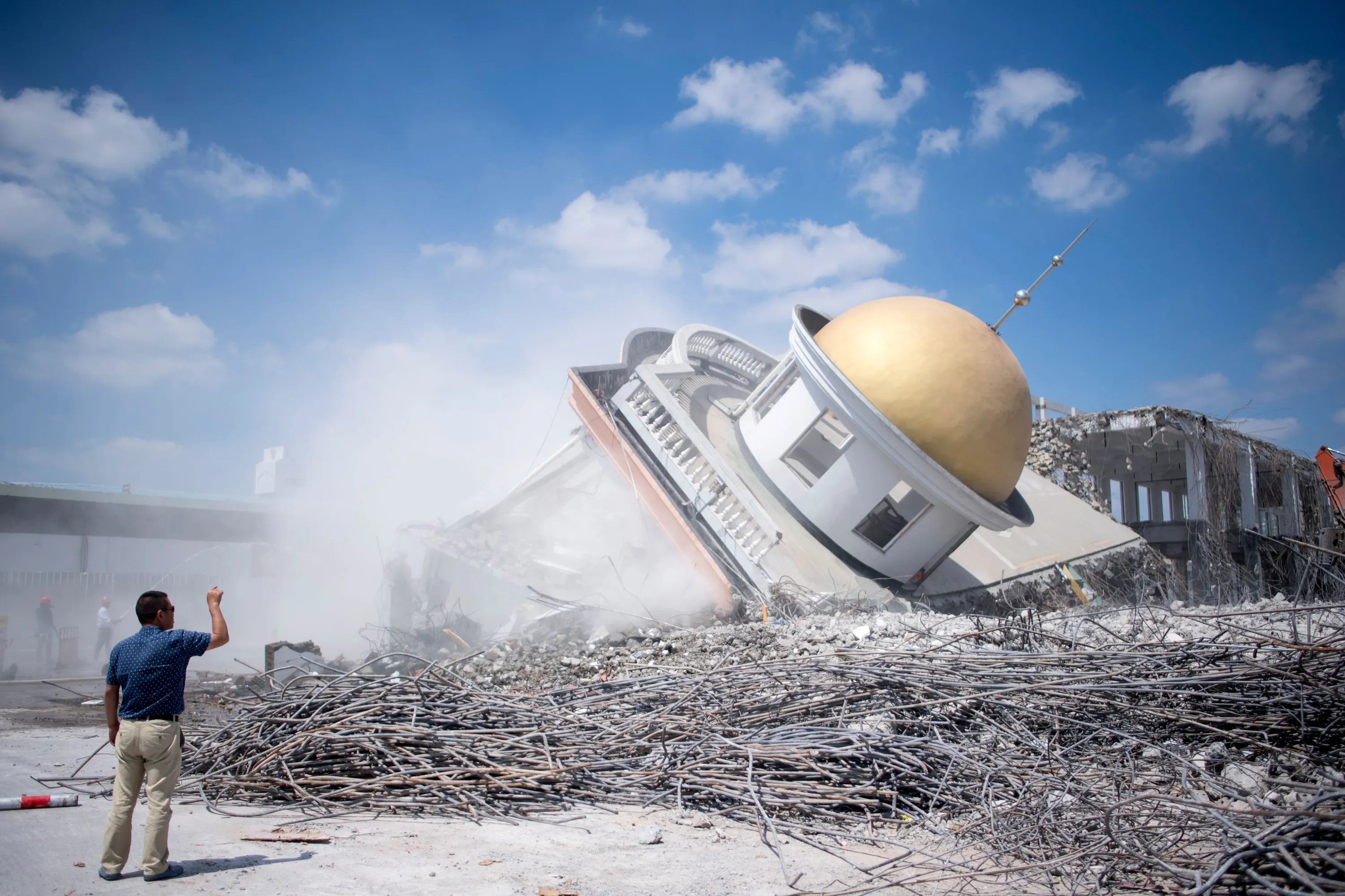 A man gestures at the demolition site of the Jiuxing furniture market in the suburbs of Shanghai on May 22, 2017. The market used to consist of an indoor and outdoor complex that housed shops selling building materials, furniture and household items. (Photo by Johannes Eisele/AFP Photo)