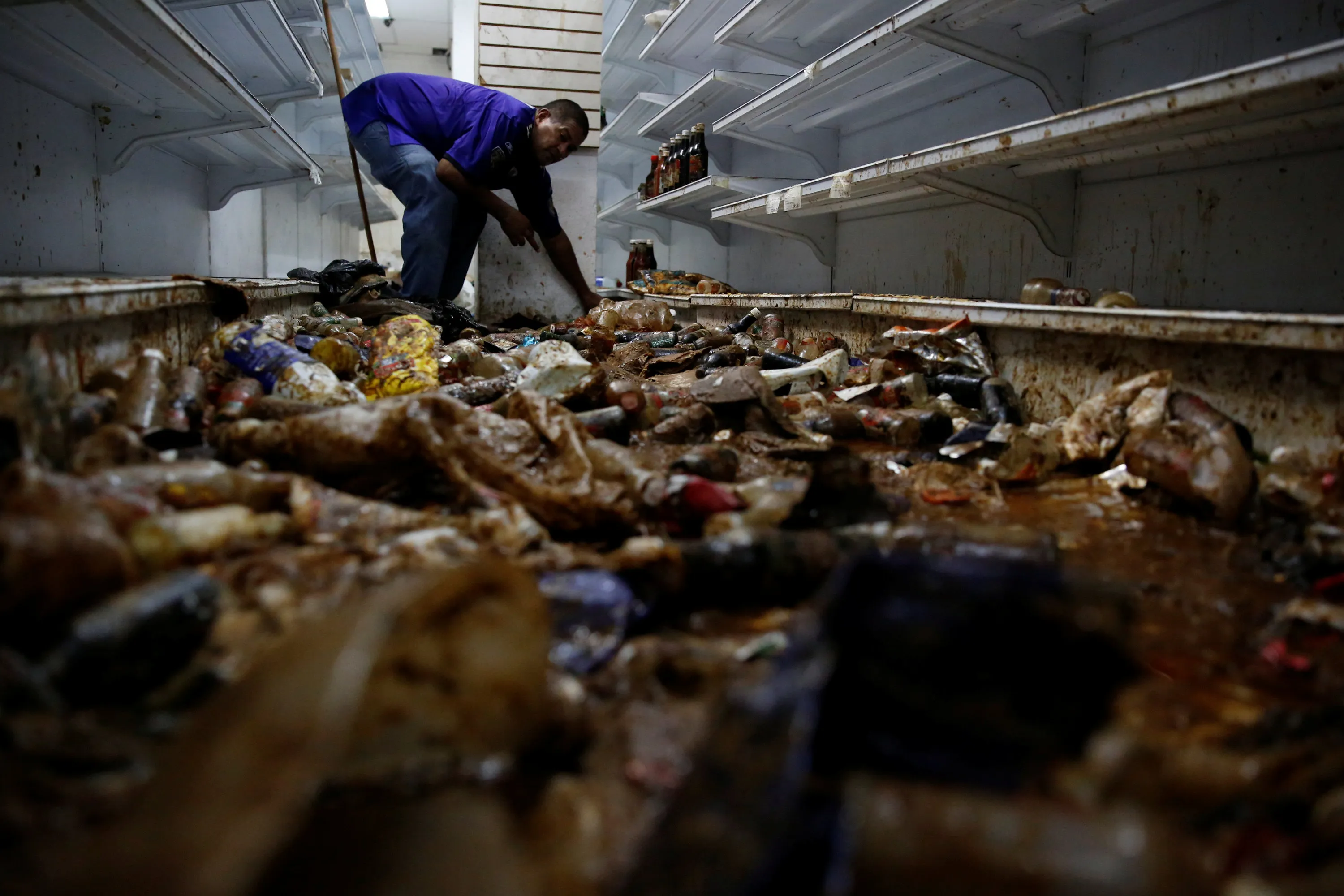 A worker looks for valuables among the damaged goods in a supermarket, after it was looted in Caracas, Venezuela April 21, 2017. (Photo by Carlos Garcia Rawlins/Reuters)