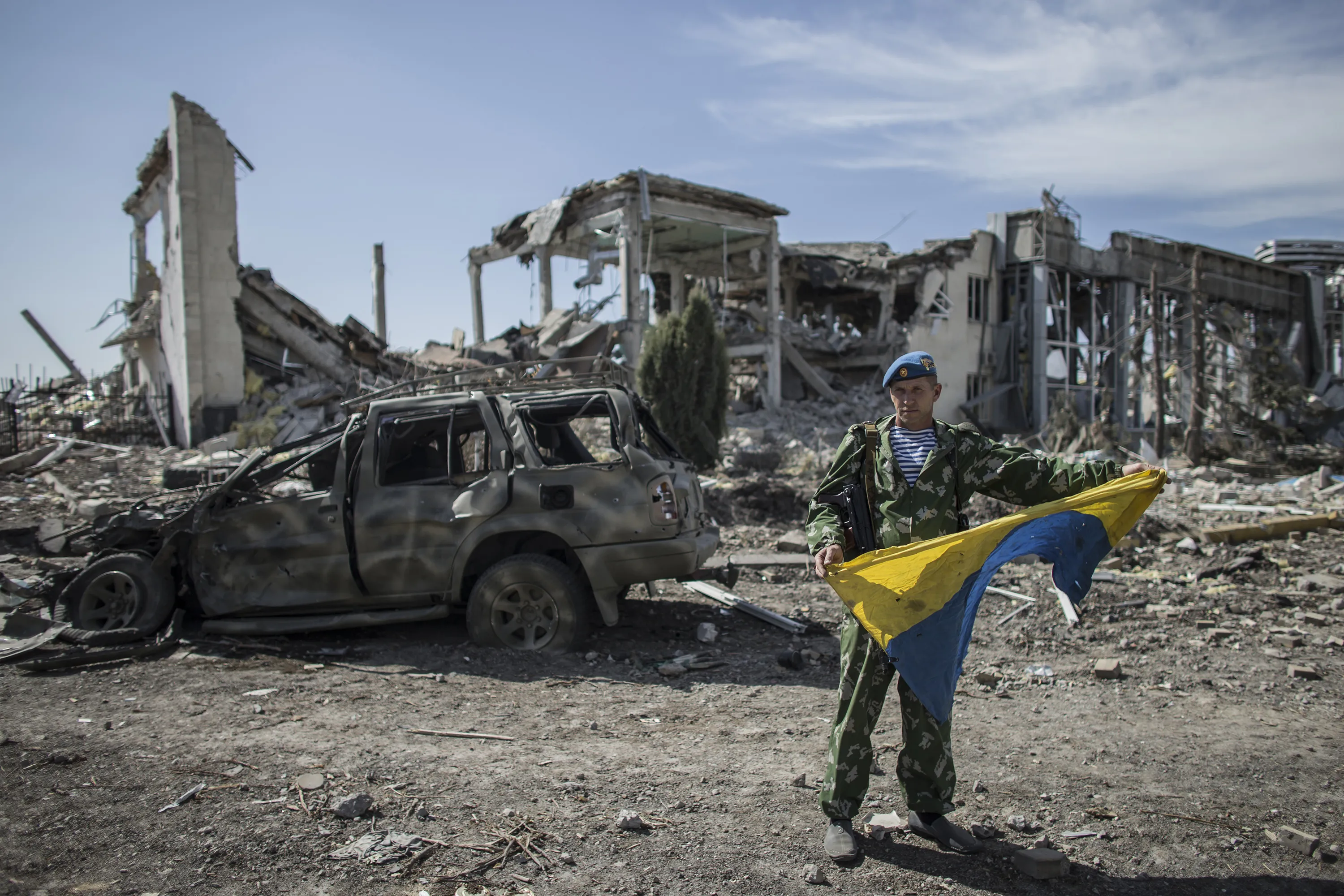 A pro-Russian rebel displays a captured Ukrainian flag at the destroyed airport in Luhansk, eastern Ukraine, September 14, 2014. Ukraine's defence minister said on Sunday that NATO countries were delivering weapons to his country to equip it to fight pro-Russian separatists and “stop” Russian President Vladimir Putin. (Photo by Marko Djurica/Reuters)