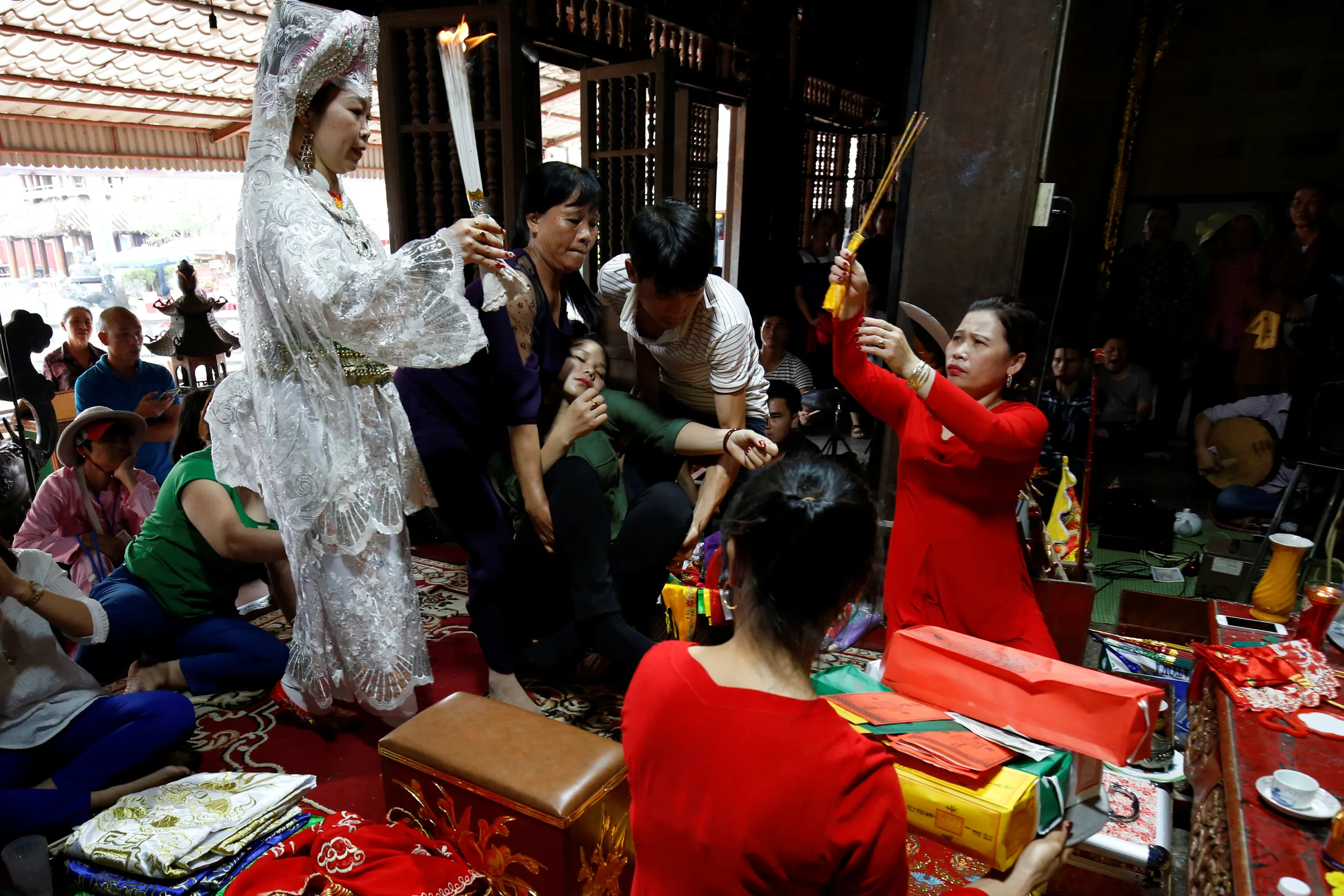 Pham Thi Thanh reacts during a ritual at a Hau Dong ceremony at Phu Day temple in Nam Dinh province, outside Hanoi, Vietnam, May 7, 2017. (Photo by Reuters/Kham)