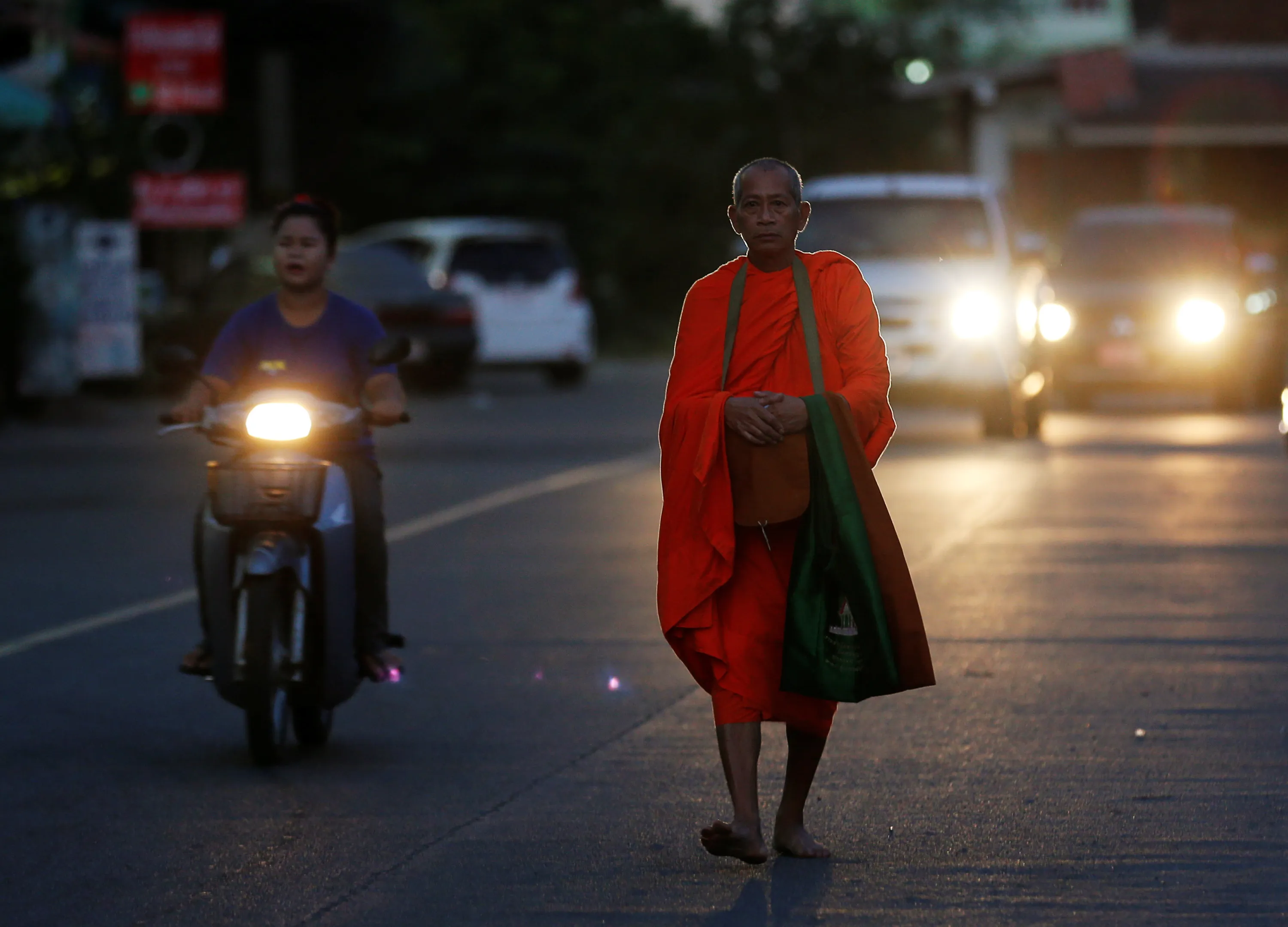 A Buddhist monk walks along a street to receive food from people in Nonthaburi province, on the outskirts of Bangkok, Thailand February 8, 2017. (Photo by Chaiwat Subprasom/Reuters)