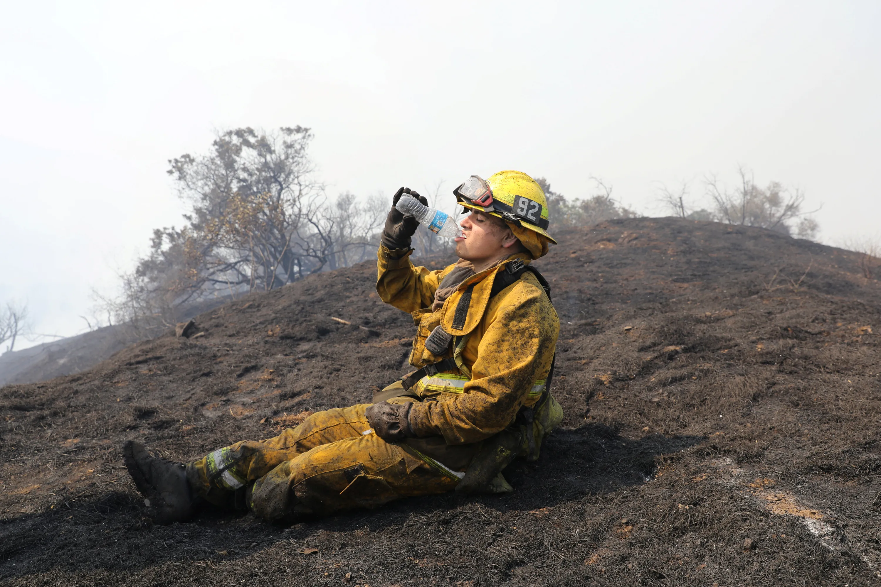 A firefighter takes a break after fighting a wildfire behind the Getty Center in Mandeville Canyon in Los Angeles, California, U.S., May 28, 2017. (Photo by Lucy Nicholson/Reuters)