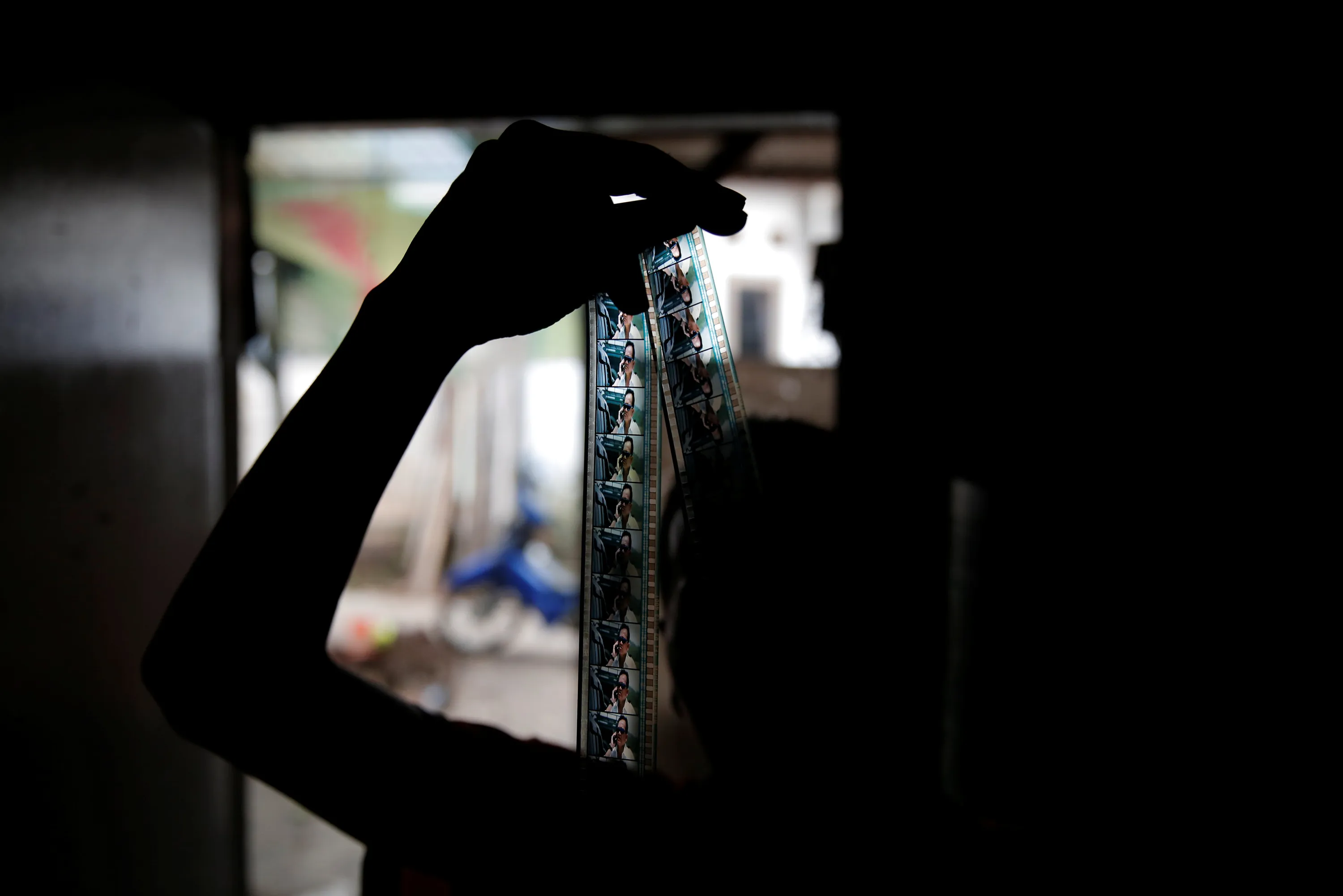 Kamaluddin checks a 35mm film strip at his workshop in Tangerang, Indonesia, March 11, 2017. (Photo by Reuters/Beawiharta)