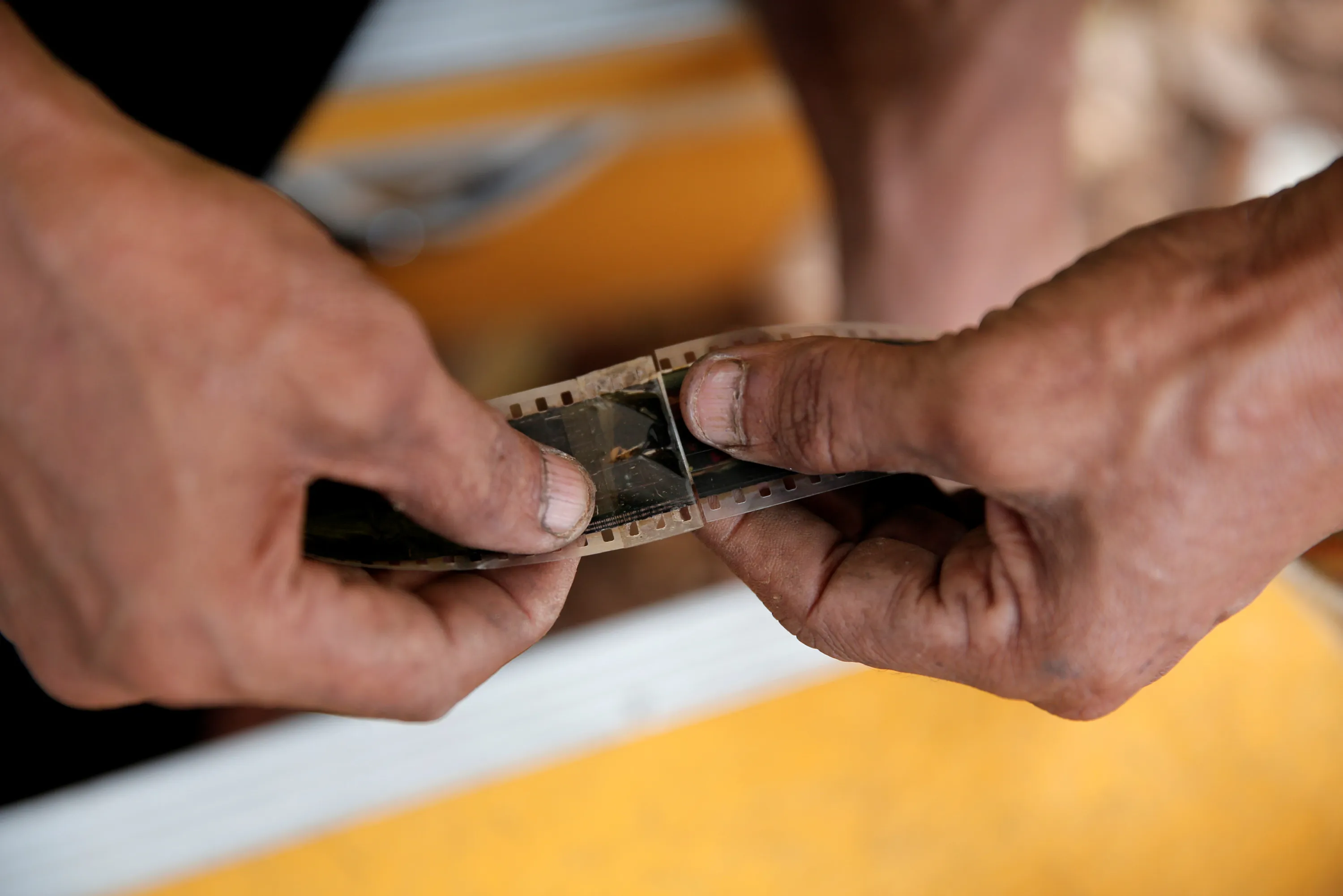 A worker re-connects a broken film strip before a wedding party in Bogor, Indonesia, February 18, 2017. (Photo by Reuters/Beawiharta)