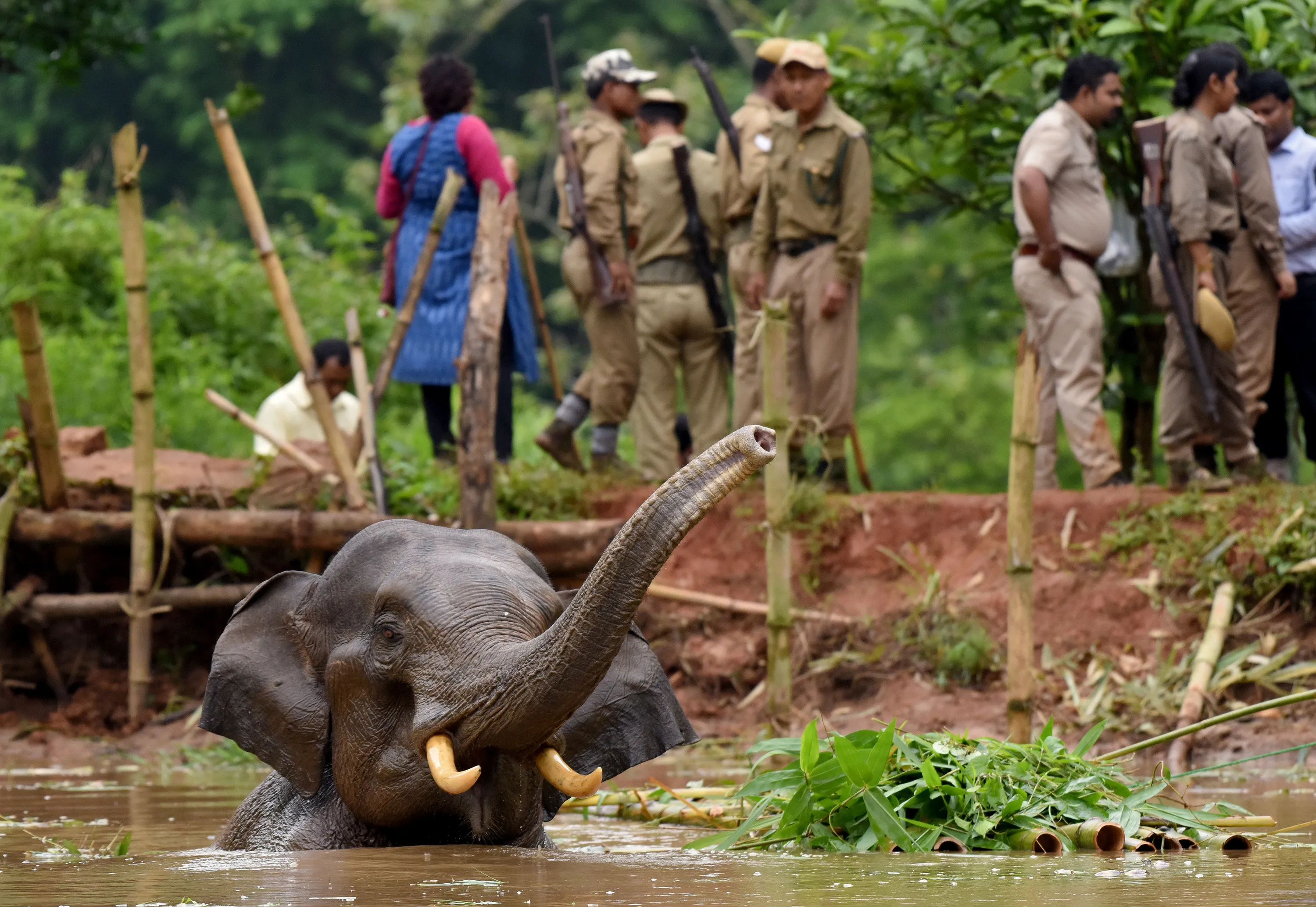 Forest officials try to rescue an injured elephant who fell into a pond at the Amchang Wildlife Sanctuary on the outskirts of Guwahati, India May 24, 2017. (Photo by Anuwar Hazarika/Reuters)