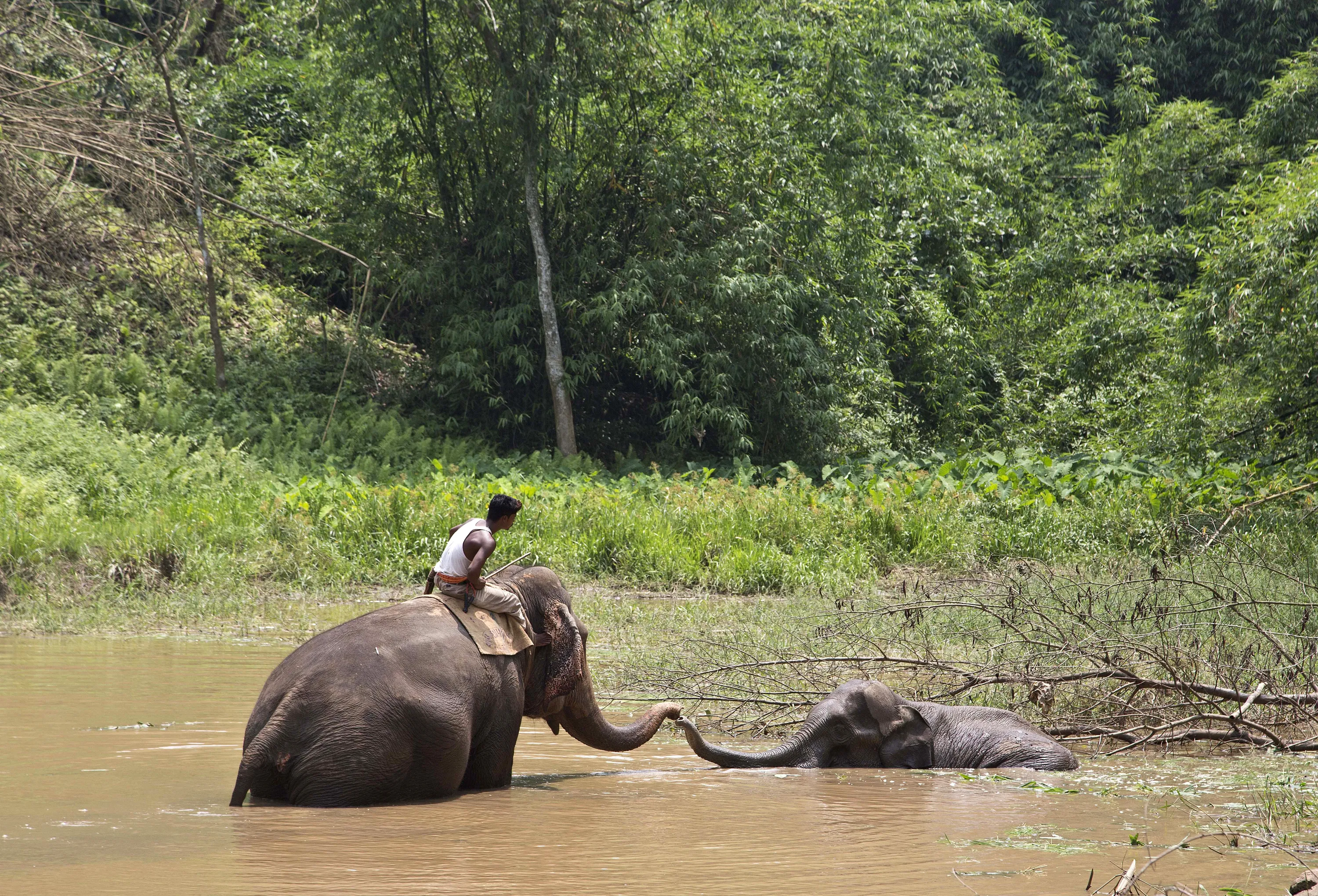 A domestic elephant stands by a 10-year-old wild tusker that is stuck with a rear leg injury at Amchang Wildlife Sanctuary, 40 kilometers (25 miles)east of Gauhati, India, Wednesday, May 24, 2017. Veterinarians are nursing the 10-year-old male elephant to help it get out of the marshy area where it was spotted stuck by local villagers five days ago. This is becoming a common occurrence in the state which has a large population of wild elephants, straying out of their herds and entering swampy areas and villages. (Photo by Anupam Nath/AP Photo)
