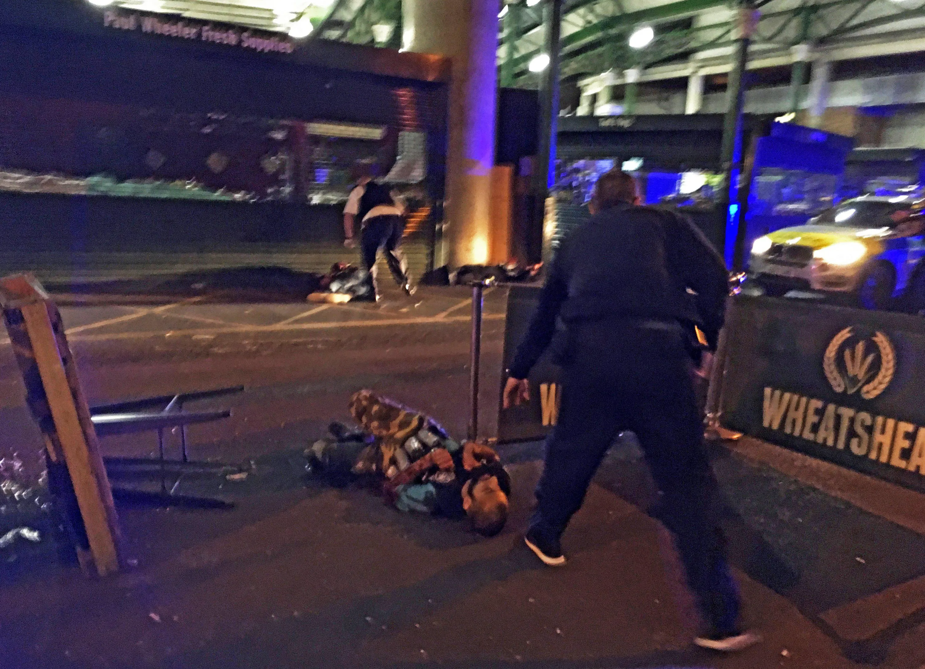 An image showing a suspected terrorist, wearing what appear to be canisters around his waist, on the ground after being knocked down by police officers during in Borough Market, in London, Britain, late 03 June 2017 (issued 04 June 2017). At least seven members of the public were killed and dozens injured after three attackers on late 03 June plowed a van into pedestrians and later randomly stabbed people on London Bridge and nearby Borough Market. The three attackers wearing fake suicide vests were shot dead by police who is treating the attack as a “terrorist incident”. (Photo by Gabriele Sciotto/EPA)