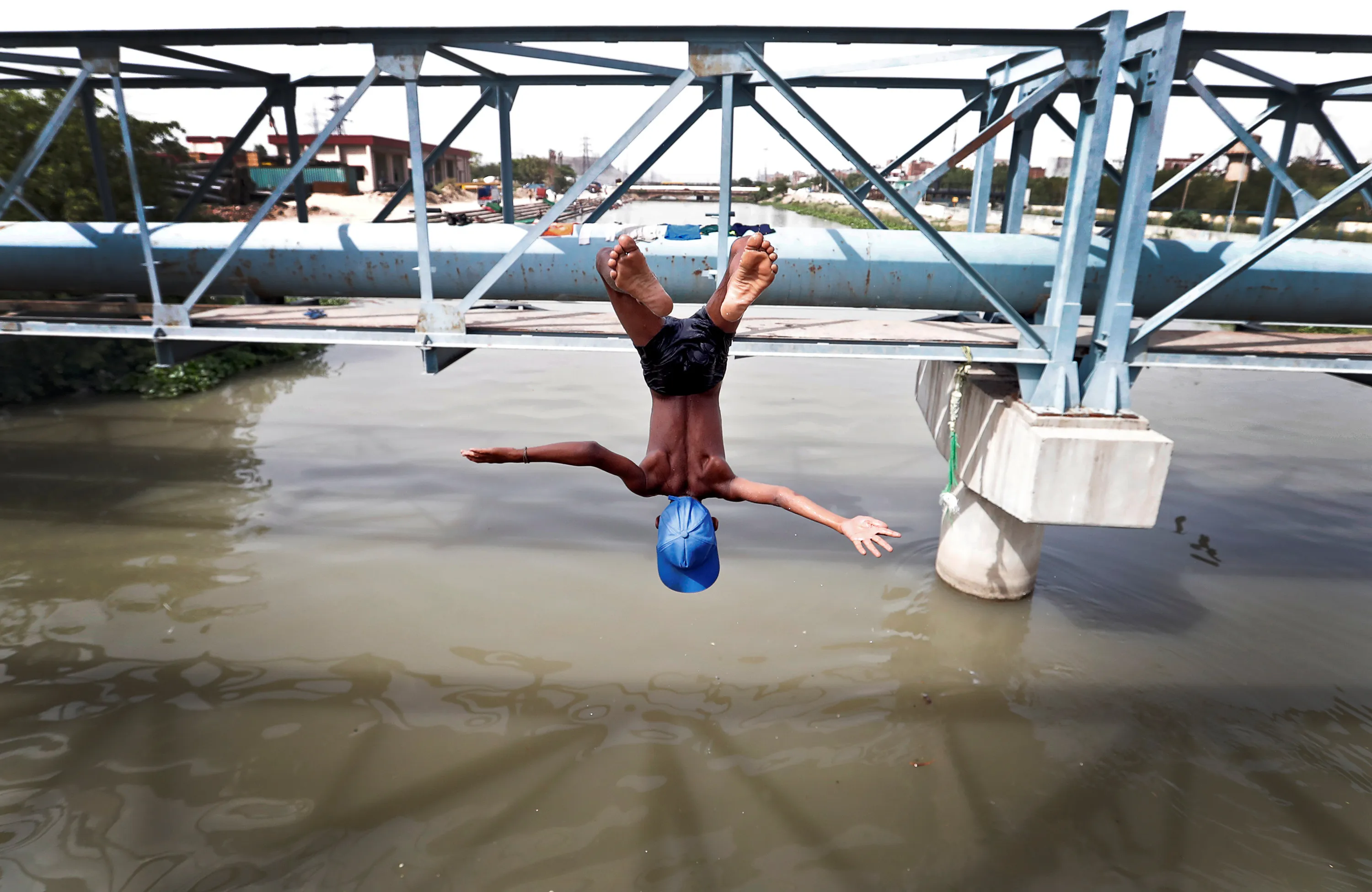A boy jumps from a water pipe into a canal as temperatures soar in New Delhi, India, June 6, 2017. (Photo by Cathal McNaughton/Reuters)