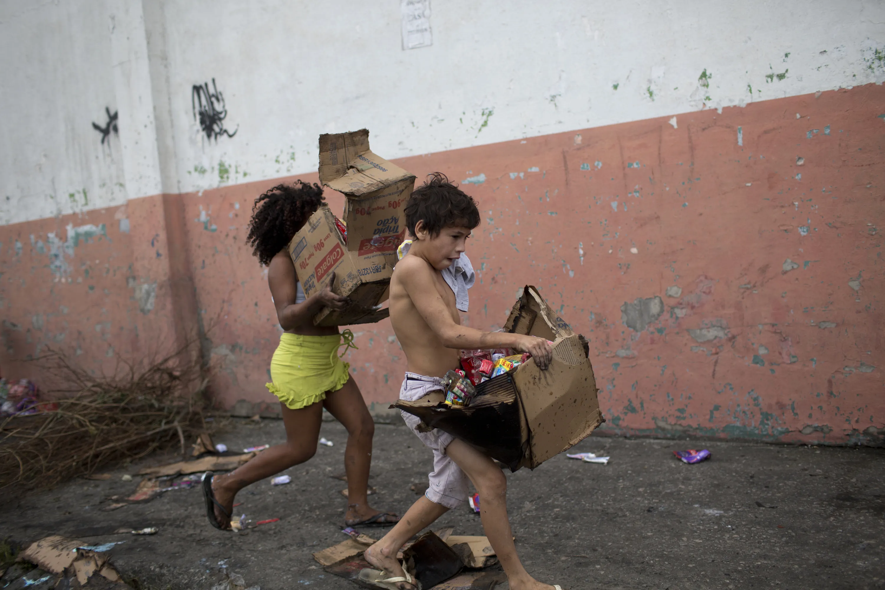 In this Tuesday, May 2, 2017 photo, children run off with boxes they filled with merchandise they salvaged from a cargo truck allegedly set on fire by drug traffickers, in Rio de Janeiro, Brazil. Several public buses and cargo trucks were torched in Rio de Janeiro on Tuesday in what Brazilian military police said was likely gang retaliation for a large anti-drug operation. (Photo by Silvia Izquierdo/AP Photo)