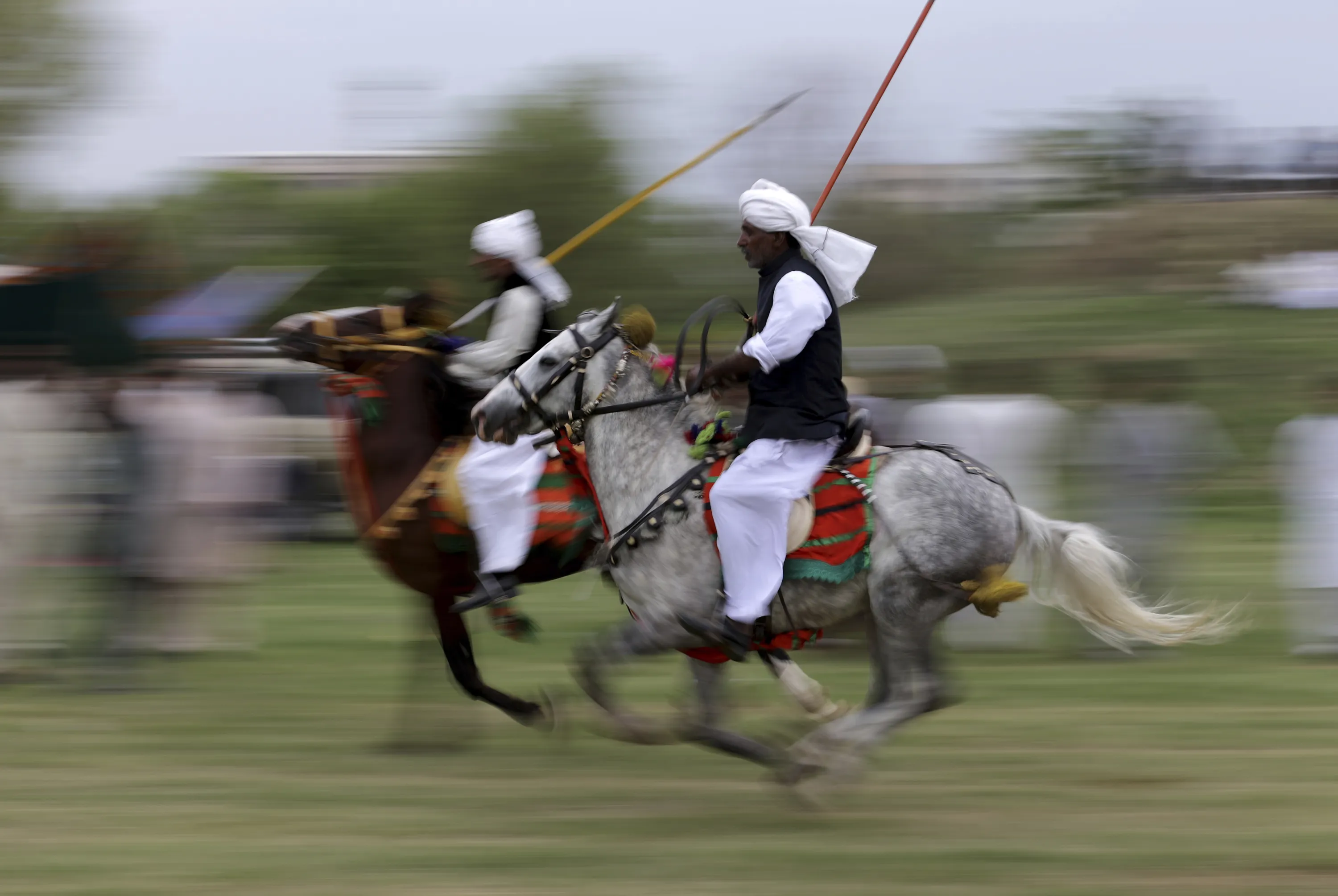 Pakistani riders proceed to their targets during competition organized by the Pakistan Tent Pegging Association in Islamabad, Pakistan, Friday, April 21, 2017. In tent pegging, a horseman gallops and uses a sword or a lance to pierce, pick up, and carry away a wooden peg. (Photo by B.K. Bangash/AP Photo)